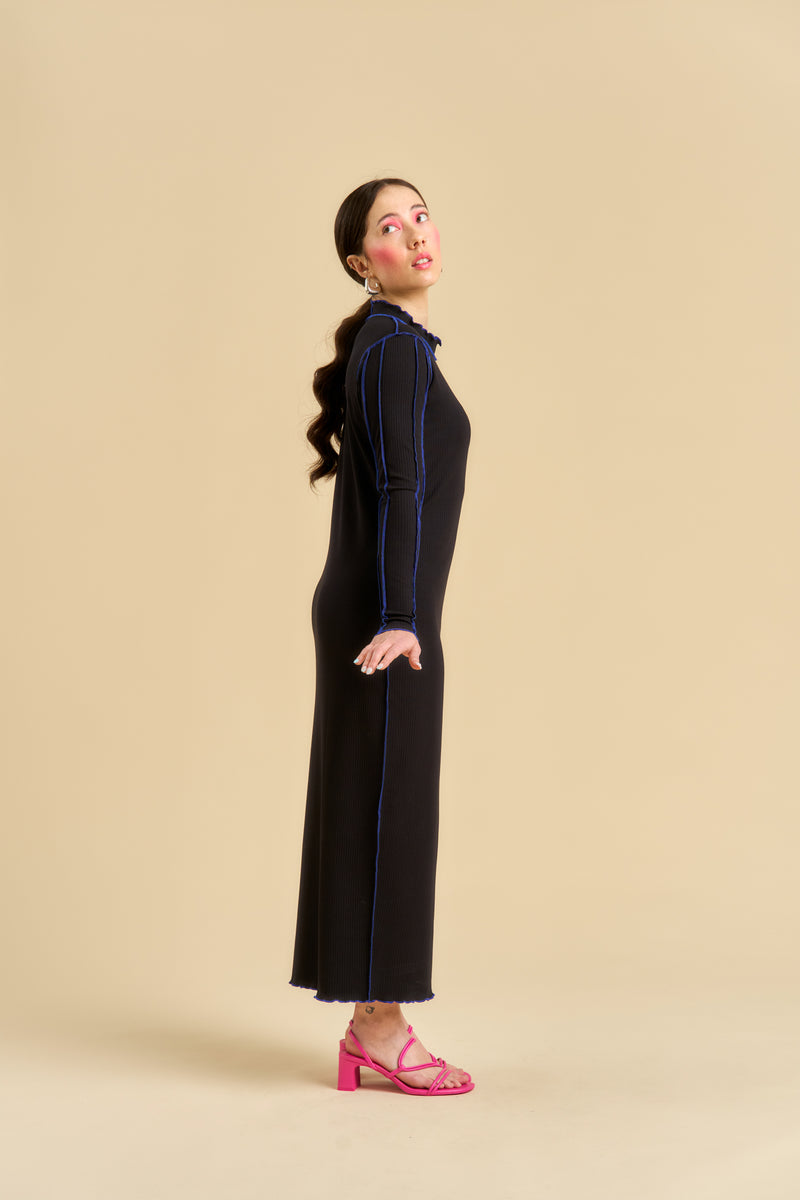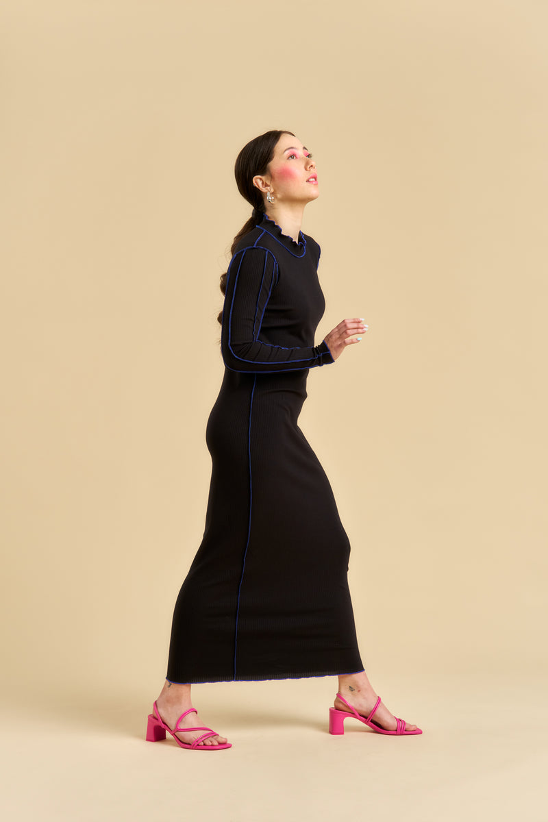 Pitkähihainen Drucilla ribbimekko on ajaton ja helposti yhdisteltävä vaate. Selkeälinjainen, tyköistuva malli korostaa kauniisti vartalon siluettia, ja joustava ribbineulos tekee mekosta mukavan käyttää. Mekko toimii kauniisti sellaisenaan, mutta on myös erinomainen kerrospukeutumiseen esimerkiksi neuletakin tai jakun kanssa. Matala poolokaulus viimeistelee siistin ja modernin ilmeen. Pääntietä, hihoja ja helmaa korostaa hienostunut sininen koristetikkaus, joka tuo mustaan mekkoon raikkaan ja naisellisen yksityiskohdan. Mekon materiaali on LENZING™ ECOVERO™ Viskoosia*, jonka ansiosta kangas tuntuu iholla ylellisen pehmeältä ja laskeutuu kauniisti. Helma on nilkkapituinen.