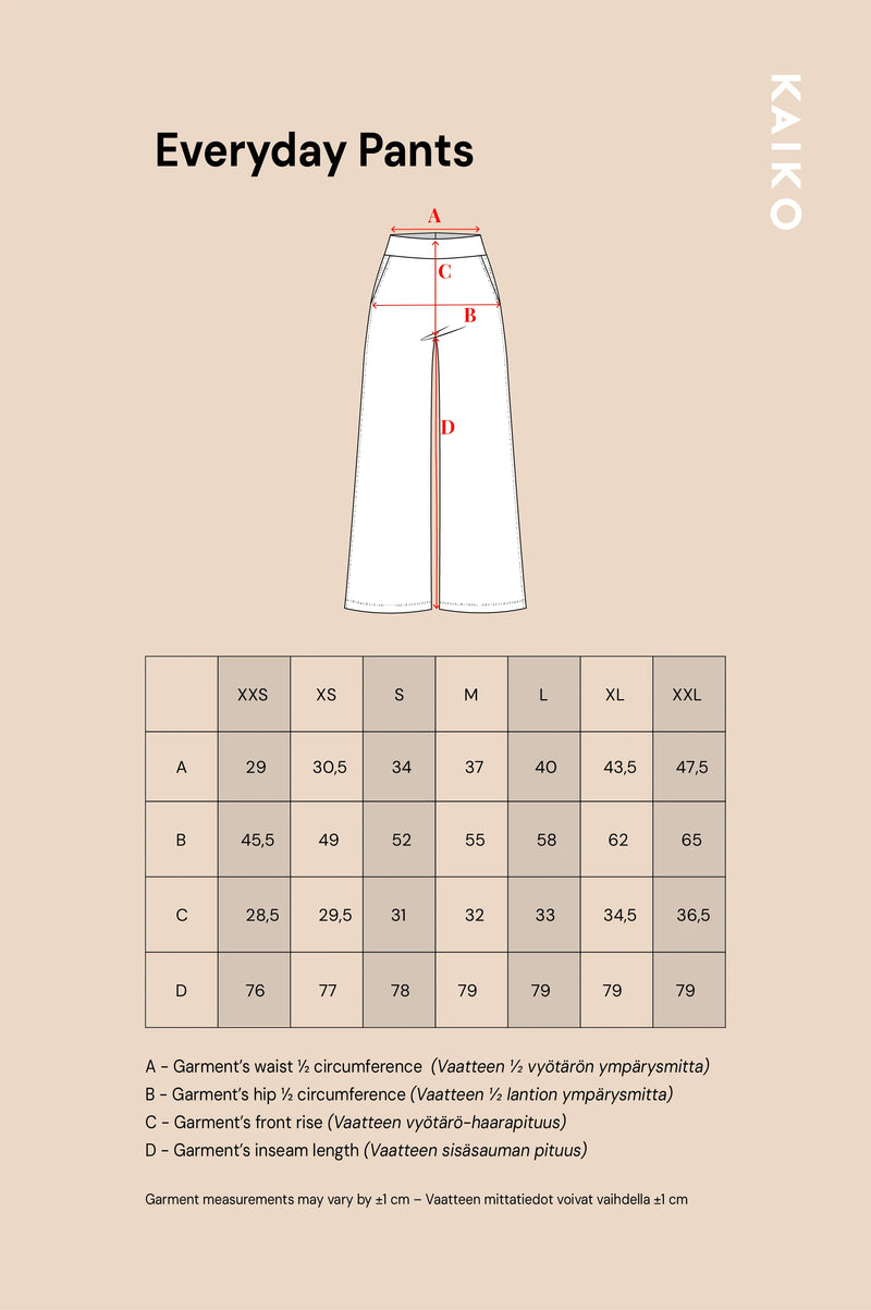 Skarpit Everyday Pants -housut eivät tingi mukavuudesta. Napakasta ja joustavasta ponte roma -interlock-neuloksesta valmistetut housut näyttävät skarpeilta, ja tuntuvat päällä ihanan pehmeiltä. Housuissa on leveä joustava vyötärö (5 cm korkea) ja edessä taskut. Sivusaumoissa kulkee denim-tikkaus, joka luo housuihin ekstraskarppia fiilistä. Housuissa on täyspitkä lahje (katso sisäsauman pituudet mittataulukosta, viimeinen kuva).