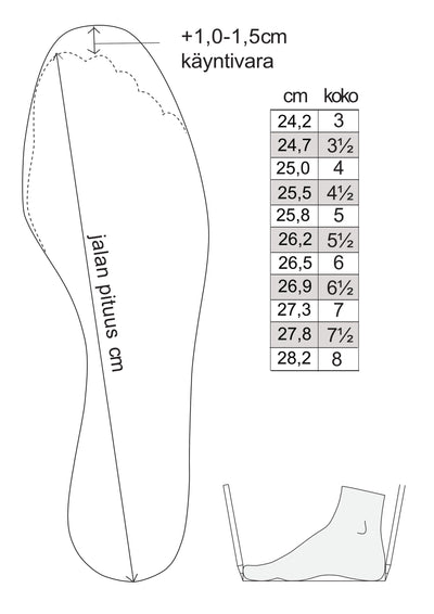 Tuotteessa on käytetty laadukasta portugalilaista nahkaa, joka on kyllästetty vettä- ja likaahylkiväksi. Voit puhdistaa kengät varovasti kostutetulla sienellä tai pehmeällä harjalla. Nahka pysyy hyvänä pitkään, kun sitä hoidetaan säännöllisesti nahalle tarkoitetuilla tuotteilla kuten nahkarasvalla. Jos kengät kastuvat, kuivaa ne ilmavasti huoneenlämmössä.
