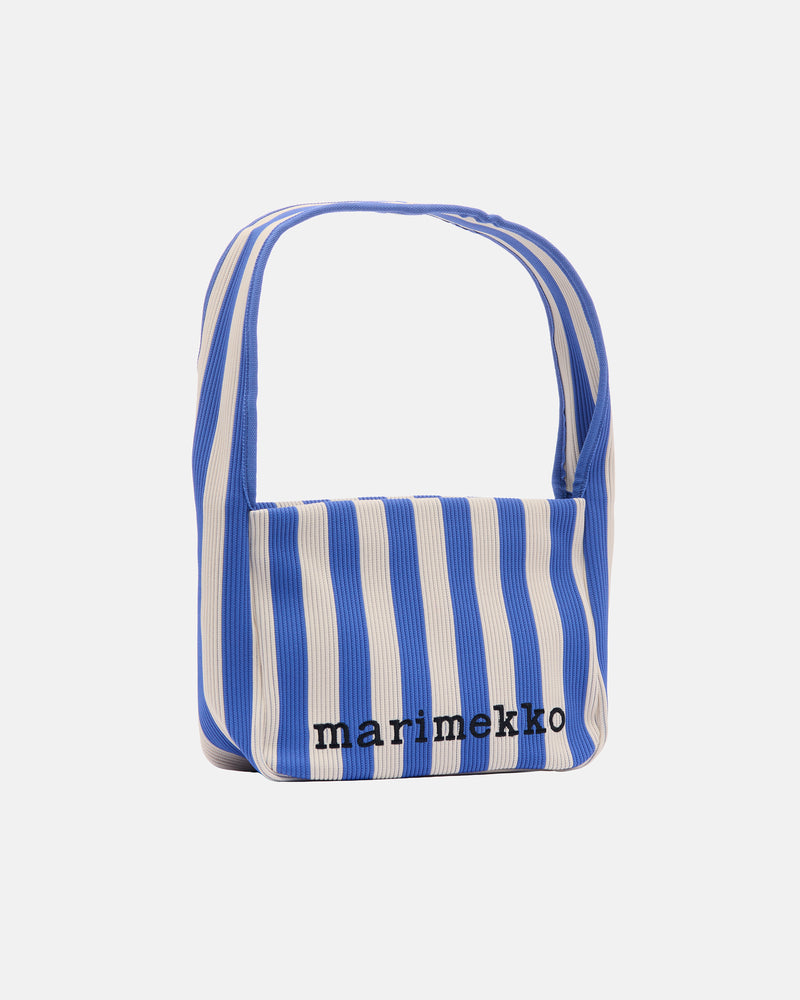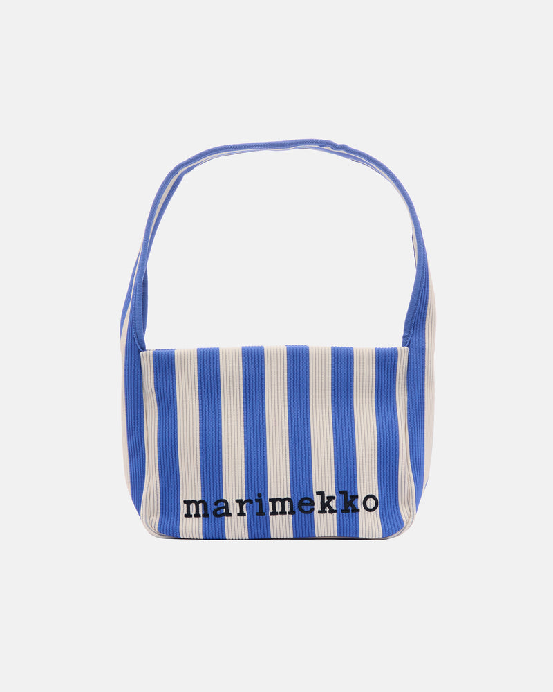 Knitted Shoulderbag -olkalaukussa on jacquard-kudottu Merirosvo-kuosi. Ryhdikkäässä laukussa on raidallinen pinta. Laukussa on leveä olkahihna, vetoketjusuljenta ja brodeerattu Marimekko-logo etupuolella.