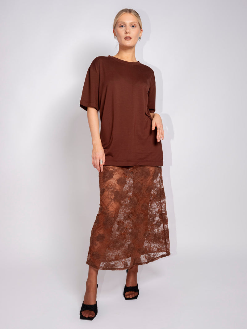 This exquisite brown lace skirt is a timeless piece that radiates elegance and femininity. Pair it with our matching lace blouse for a beautifully coordinated look, perfect for evening events or special occasions. For a modern twist, style it with a simple top or knitwear for effortless everyday chic.