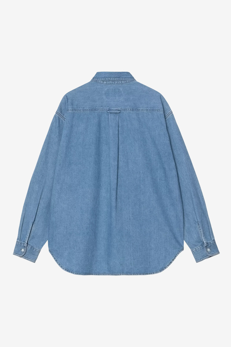 The L/S Lucas Shirt is made in a loose fit from midweight cotton denim. The item also has a buttoned front and collar. A woven 'C' Logo appears on the chest.
