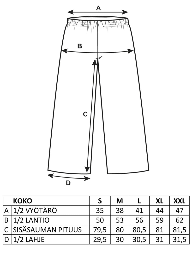 Mitat: Housut ovat mitoitukseltaan väljät. Mittataulukkokuvasta voit tarkistaa eri kokojen mitat. Mallilla on päällä koko S, mallin pituus 174 cm.