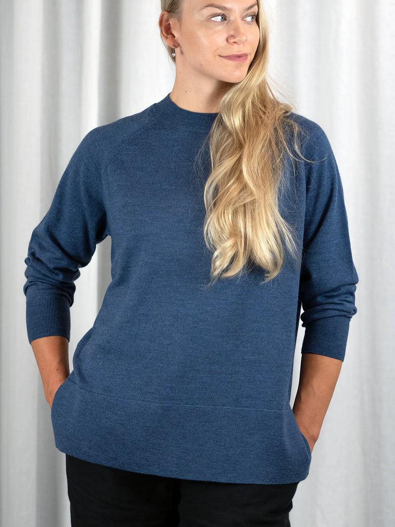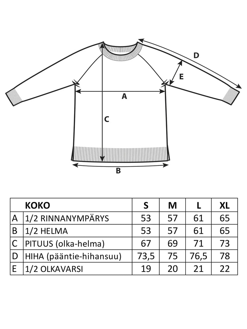 Jolie-pusero on valmistettu laadukkaasta 100% merinovillasta (mulesing free), jonka erityinen Cash Feel -viimeistys tekee neuleen tunnusta kashmirvillan pehmeän. Jolie on kevyt, lämmin ja helppokäyttöinen malli, jossa on mukavan mahtuva mitoitus. Jolie-puserossa on O-pääntie, hihat ovat normaalin leveät ja päättyvät hihansuussa resorineulokseen. Puseron vartalo on väljä ja suoralinjainen. Helmassa on leveä resorineulos, jossa sivuhalkiot. Resorineulos ei ole helmaa kiristävä, vaan jatkaa puseron suoraa linjaa ja laskeutuu kauniisti lantion alapuolelle. Puseron pituus olalta helmaan koossa M on 69 cm. Kuvassa mallilla päällä koko M.