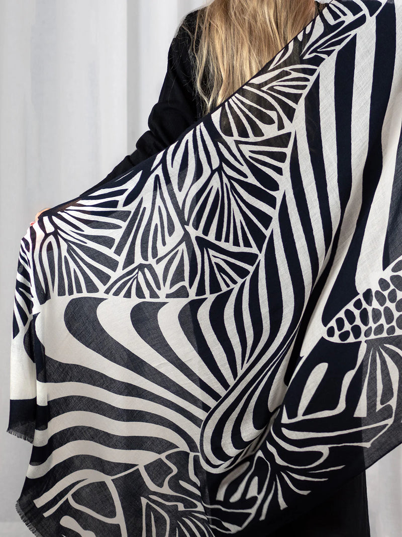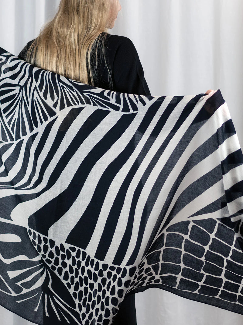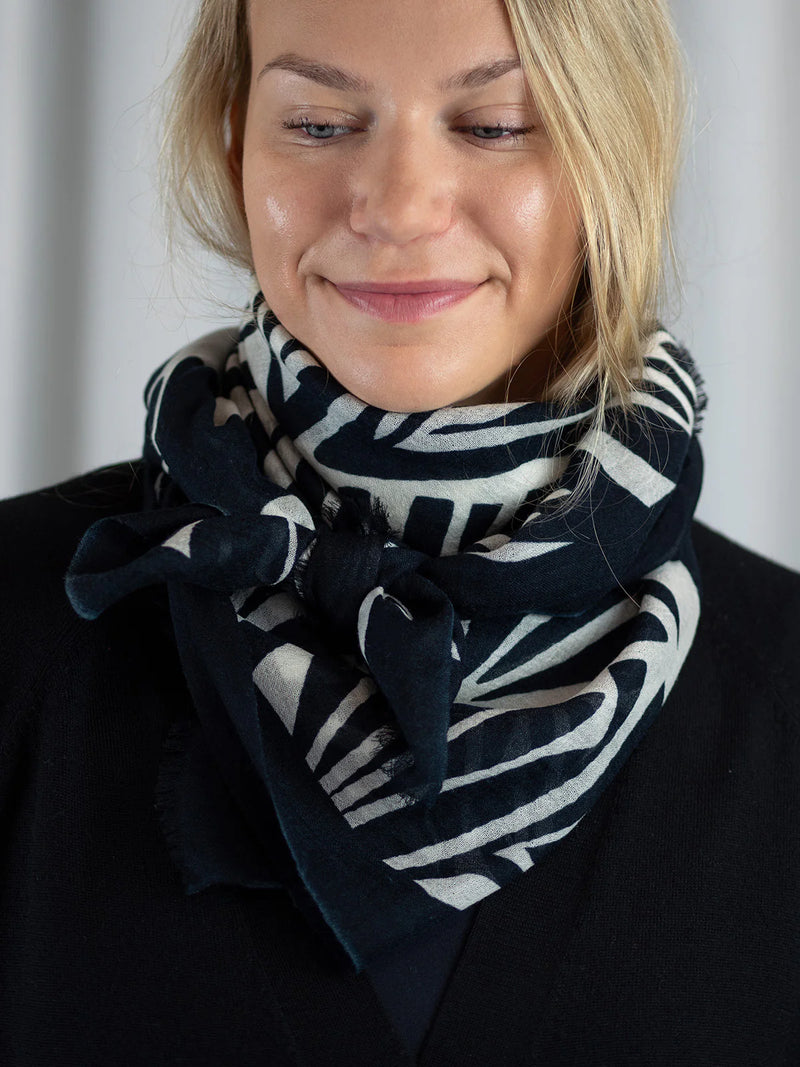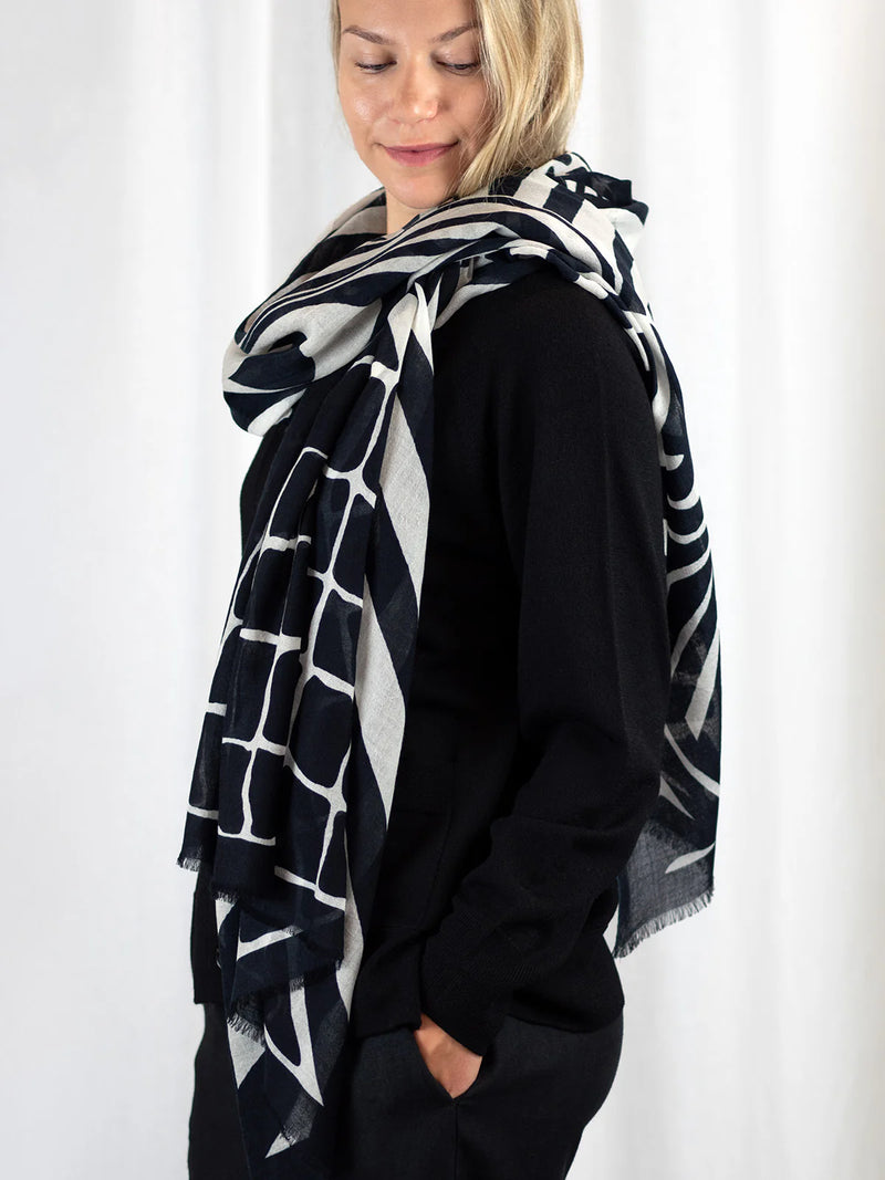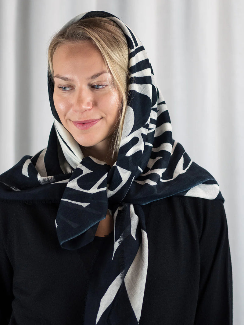 Ylellisen pehmeä ja höyhenen kevyt 100% merinovillasta (mulesing free) valmistettu huivi sopii moneen käyttöön ja asukokonaisuuteen. Voit käyttää sitä hartiahuivina, kietoa kaulaan, sitoa huiviksi päähän tai taitella sen monin kerroin kolmiomaiseksi kaulahuiviksi. Tätä huivia tulet rakastamaan käytössä! Se lämmittää hämmästyttävän paljon keveyteensä nähden. Se onkin todellinen hybridihuivi, jota voi käyttää sekä sisällä että ulkona. Kaulaan kiedottuna huivi lämmittää ulkona talvipakkasilla, sisällä se puolestaan tuntuu miellyttävän kevyeltä ja hengittävältä. Huivi on kätevä mukaan matkoille, teatteriin, ravintolaan tai minne vain, missä on syytä varautua yllättävään viileyteen. Isosta koosta huolimatta taiteltu huivi mahtuu pieneen tilaan, vaikkapa käsilaukkuun. Huivi tuntu ihoa vasten on miellyttävä ja silkkimäisen pehmeä, siksi se sopii myös monille herkkäihoisille. Huivin Haiku-painokuosissa tummansinisellä pohjalla on siniharmaa tyylitelty lehtikuvio. Kuosi on CUOSIn omaa designia.