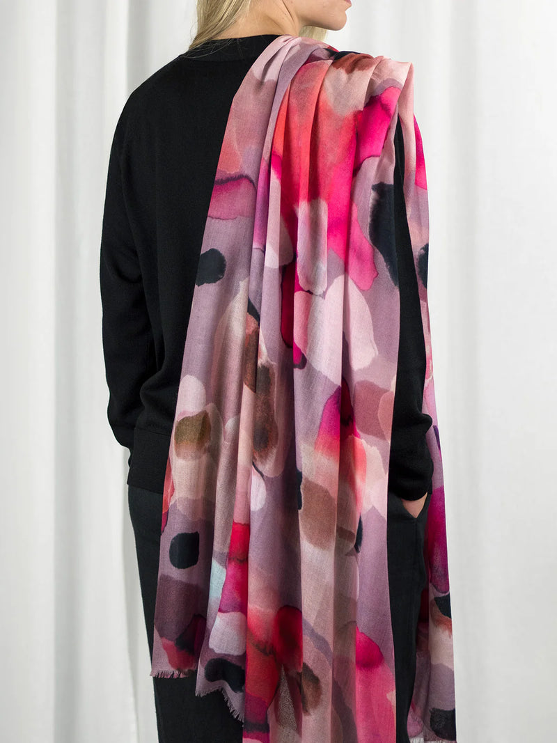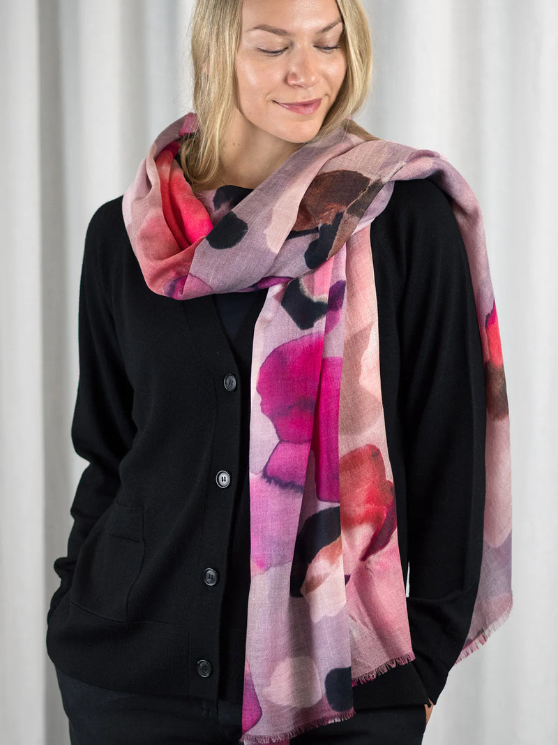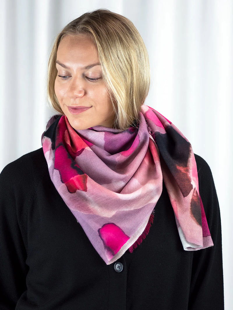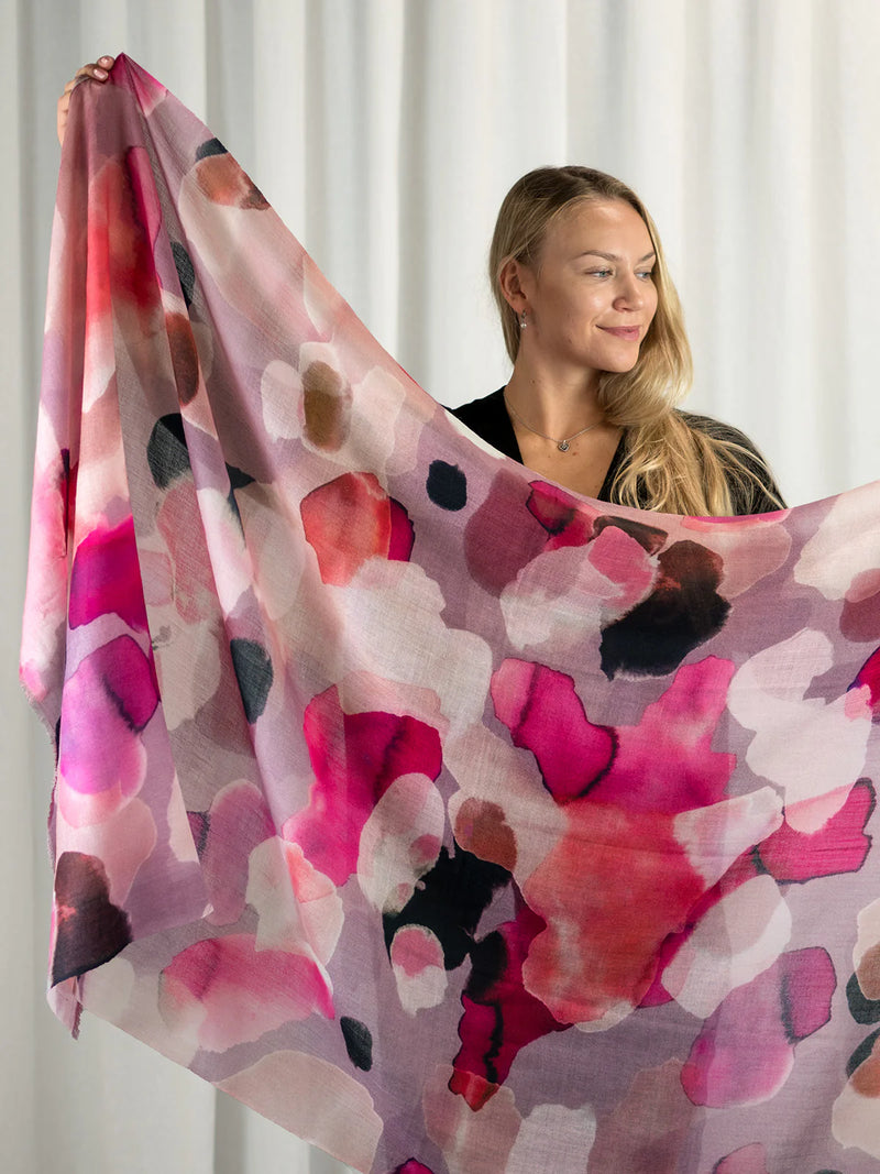 Ylellisen pehmeä ja höyhenen kevyt 100% merinovillasta (mulesing free) valmistettu huivi sopii moneen käyttöön ja asukokonaisuuteen. Voit käyttää sitä hartiahuivina, kietoa kaulaan, sitoa huiviksi päähän tai taitella sen monin kerroin kolmiomaiseksi kaulahuiviksi. Tätä huivia tulet rakastamaan käytössä! Se lämmittää hämmästyttävän paljon keveyteensä nähden. Se onkin todellinen hybridihuivi, jota voi käyttää sekä sisällä että ulkona. Kaulaan kiedottuna huivi lämmittää ulkona talvipakkasilla, sisällä se puolestaan tuntuu miellyttävän kevyeltä ja hengittävältä. Huivi on kätevä mukaan matkoille, teatteriin, ravintolaan tai minne vain, missä on syytä varautua yllättävään viileyteen. Isosta koosta huolimatta taiteltu huivi mahtuu pieneen tilaan, vaikkapa käsilaukkuun. Huivi tuntu ihoa vasten on miellyttävä ja silkkimäisen pehmeä, siksi se sopii myös monille herkkäihoisille. Punasävyinen Petal Haze-painokuosi on CUOSIn omaa designia.