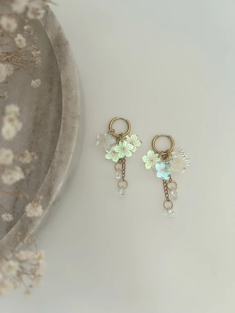 Kuurankukka - korvakorut hehkuvat kuura-aamun herkkyyttä ja luonnon kauneutta. Hologrammiakryyli tuo värien leikkiä valon osuessa koruun sekä lasipisarat kruunaavat korun kauneuden. Tämä koru myös muuntuu moniin kauniisiin tyyleihin. Vaihtele mielesi mukaan joko näyttävämpään tai minimalistiseen suuntaan. Täydellinen koru mikä muuttaa muotoaan fiiliksen mukaan! Yksi koru, monta tyyliä, täydellistä! Voi käyttää myös pelkillä Huggie - renkailla. Korujen teräosat ovat korkealaatuista ruostumatonta kirurginterästä, joka sopii herkkäihoiselle ja allergisille. Koruosat on akryylia. Suosittelemme säilyttämään korut mukana tulevassa korurasiassa, jolloin ne säilyvät siistinä sekä eivät naarmuunnu. Suojaathan korut kemikaaleilta, kosteudelta ja kosmetiikalta. Huggie-rengaskiinnitys.