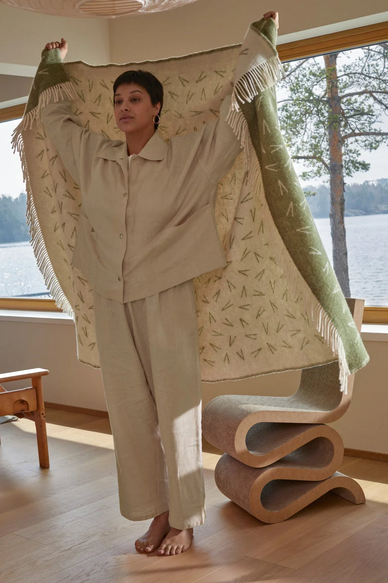 PINE NEEDLES is a blanket inspired by fallen pine needles on a trail, on a lake, and on the snow.