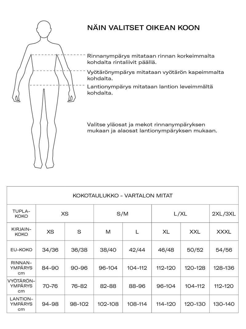 Ensimmäinen malli on 174 cm pitkä ja käyttää kokoa S/M. Toinen malli on 174 cm pitkä ja hän käyttää kokoa 2XL/3XL. Kolmas malli on 168 cm pitkä ja käyttää kokoa S/M.