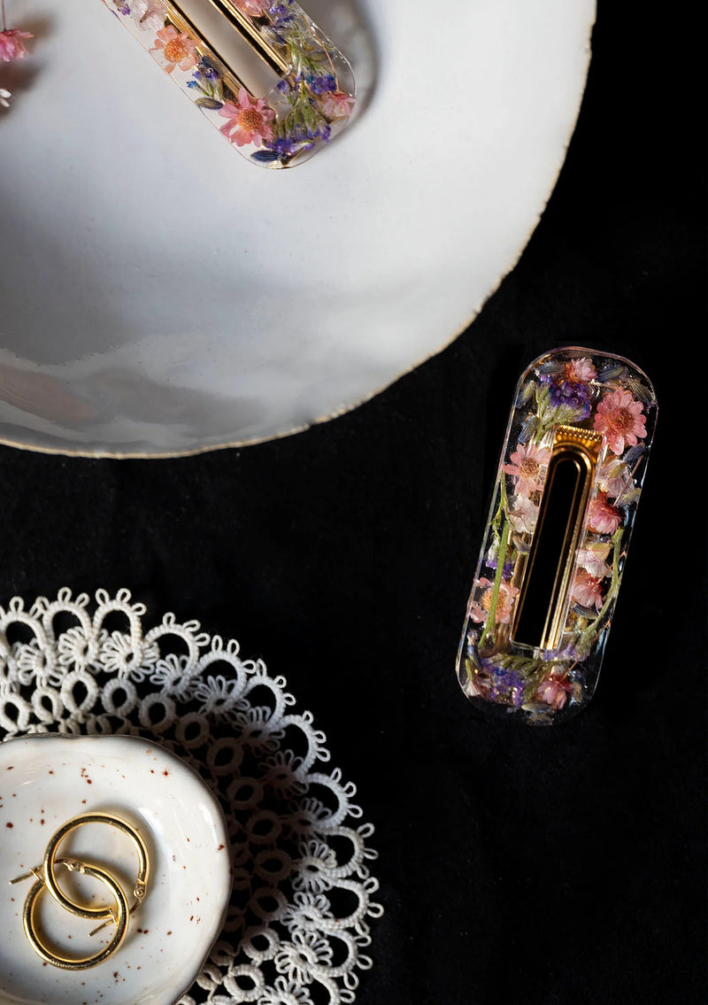 Ylellinen hiuspinni aidoista kukista. Jokainen pinni on ulkonäöltään ainutlaatuinen, sillä pinnin kukat ja terälehdet asetellaan tekovaiheessa tuotteeseen yksitellen. Kullanvärinen alligaattoriklipsi pitää hiukset tukevasti paikoillaan liukumatta. Pinnit valmistetaan huolella pientuotantona Keski-Suomessa.