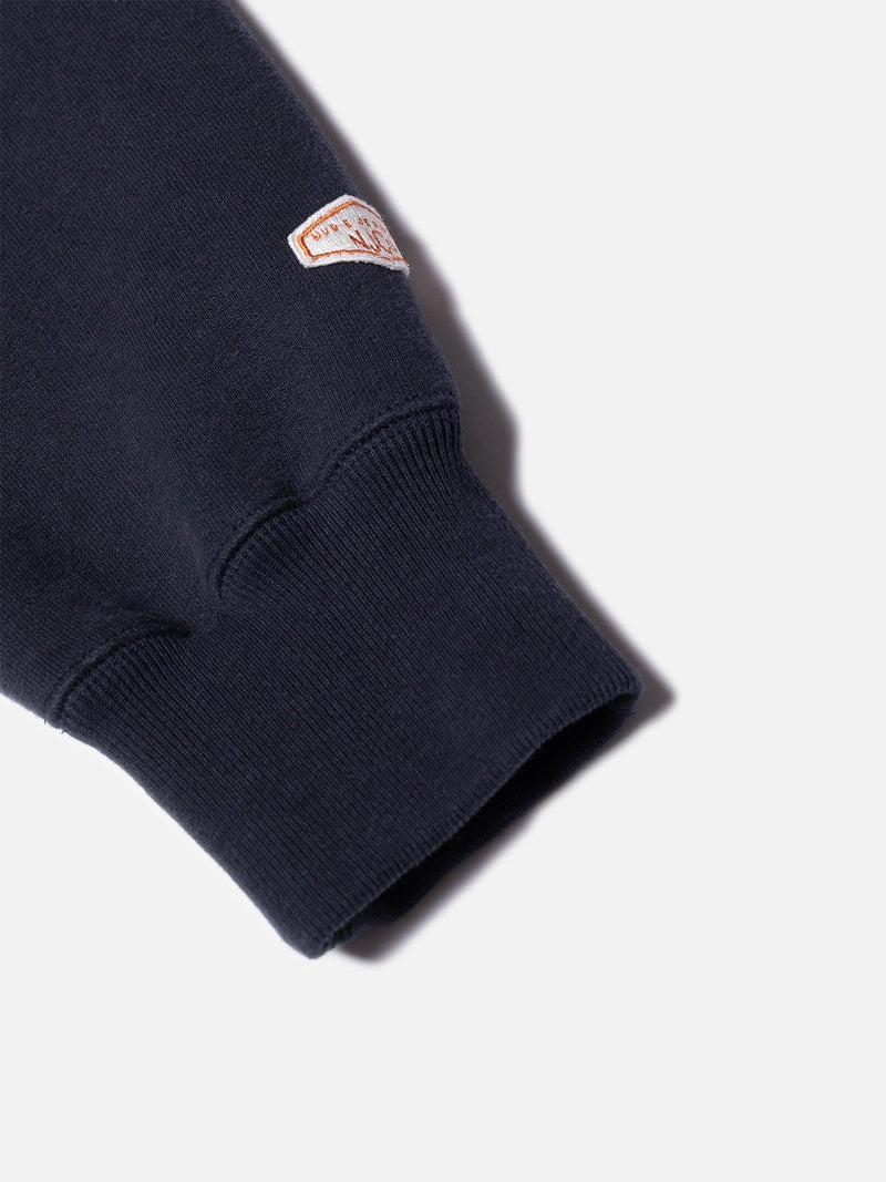 Crew neck sweatshirt made in a heavy jersey with a soft brushed inside. It's a blend of organic cotton and recycled polyester. This garment has been cut on the cross-grain instead of length grain, which is the usual way to cut clothes. It gives a more robust feeling to it.