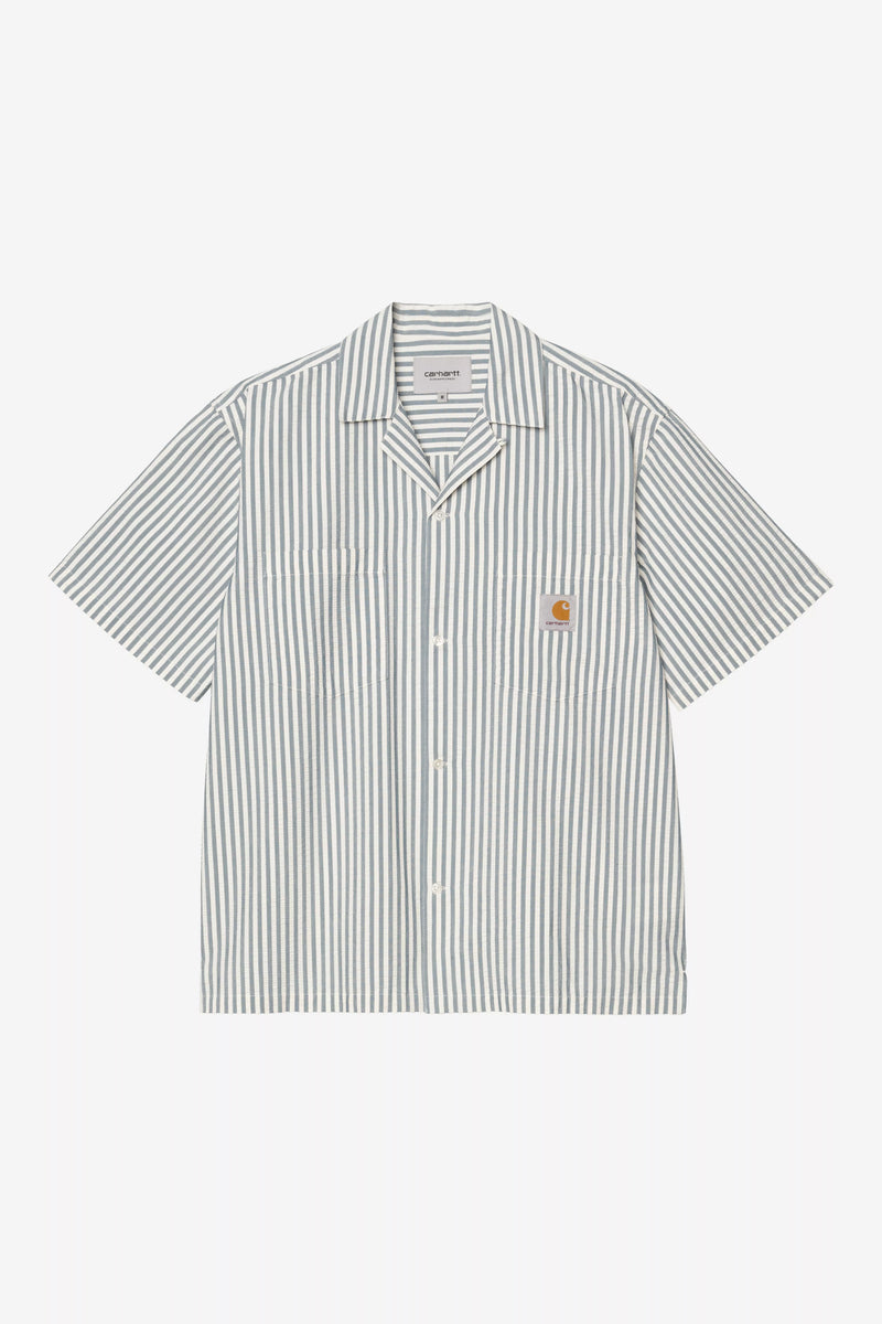 The S/S Leavel Shirt is made in a loose fit from a lightweight, textured polycotton seersucker, which has been garment-washed for a softer feel. A woven Square Label appears on the chest pocket.