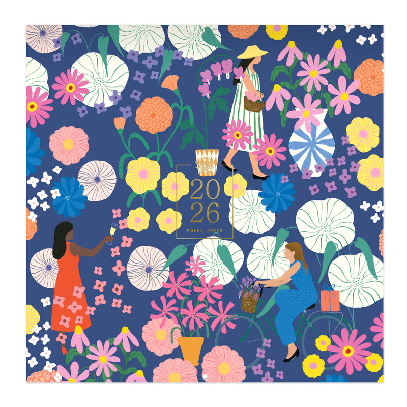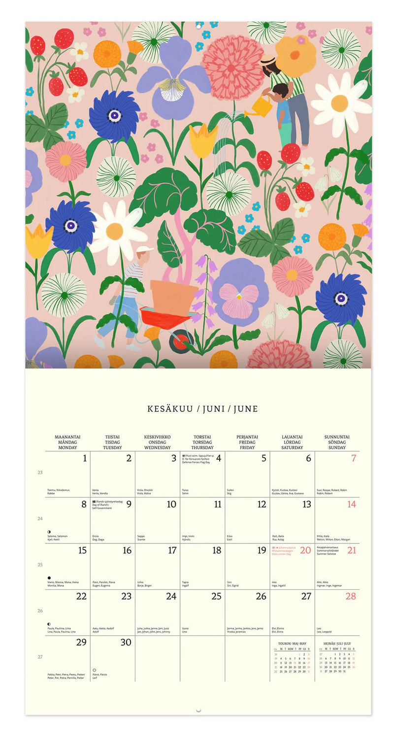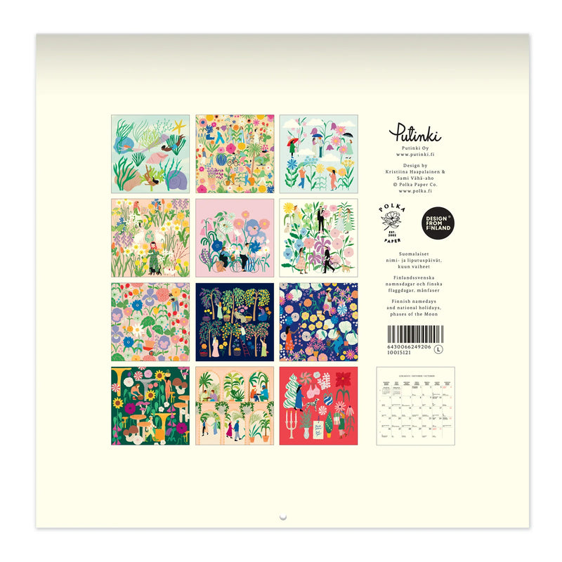 Seinäkalenteri vuodelle 2026, Polka Paperin tunnelmallisilla kuvituksilla. Kannessa kultafolioituja yksityiskohtia. Kielet: suomi, ruotsi ja englanti. Sisältää suomalaiset ja suomenruotsalaiset nimi- ja liputuspäivät, sekä kuun vaiheet. Koko 30 x 30 cm. Kalenterin alussa on yhdellä aukeamalla kuukaudet loka-, marras- ja joulukuu 2025. Sen voi siis ottaa jo käyttöön lokakuussa 2025!