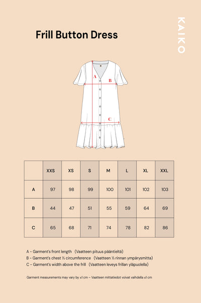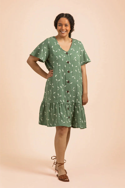 Vastuullisesti valmistetussa mekossa on väljä istuvuus, v-pääntie, kevyesti kellotetut hihat ja keskellä edessä kulkee nappirivi. Helmaa koristaa poimutettu frilla. Frillan korkeus 25 cm. Helman pituus noin polvimittainen. Kuosina Sage Wind, jonka murretun vihreää pohjaa koristavat minimalistiset lehtikuviot.