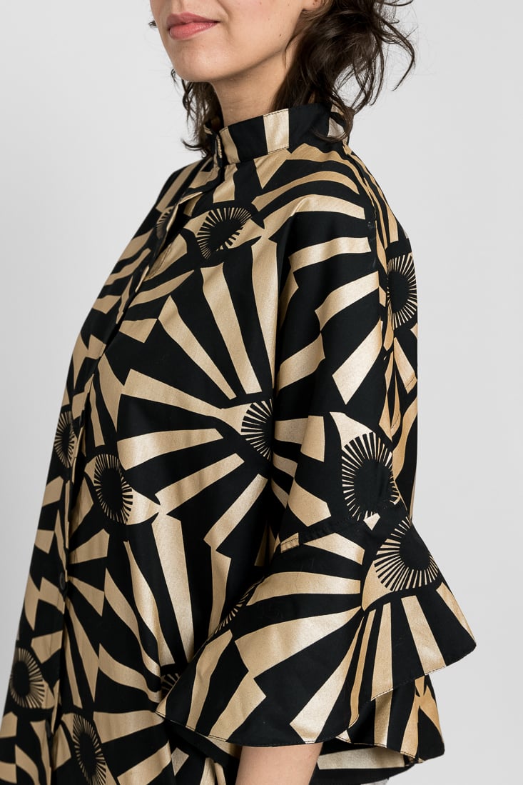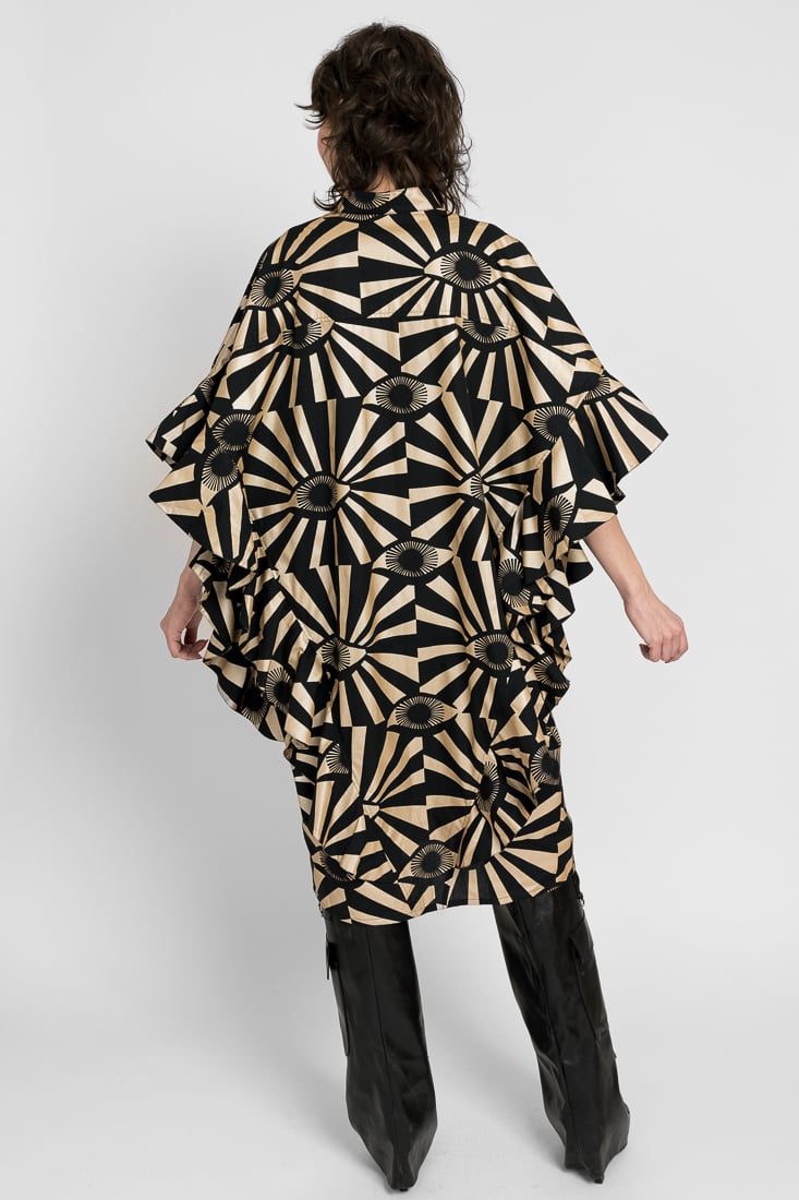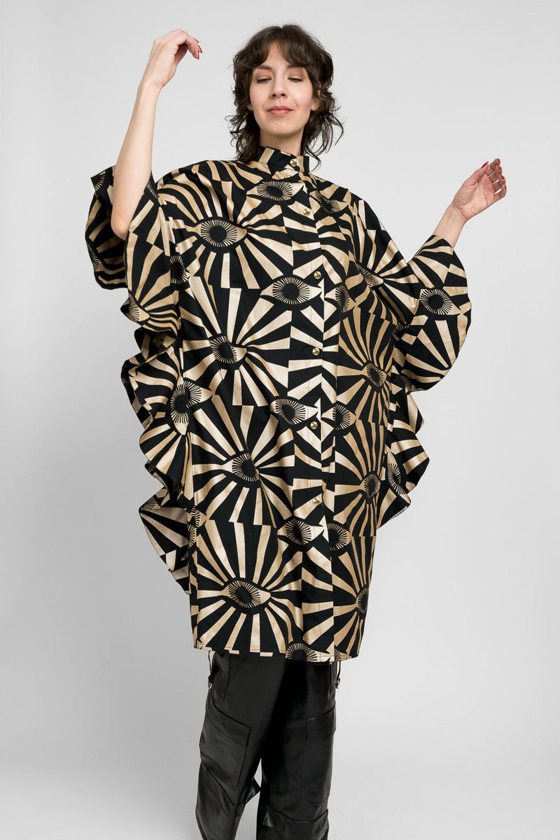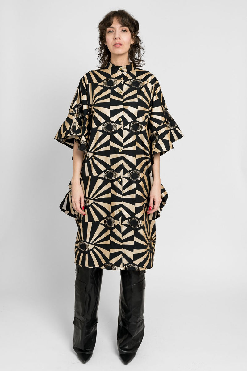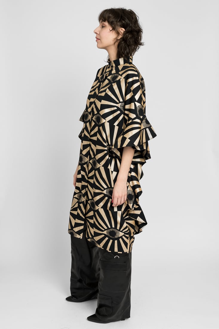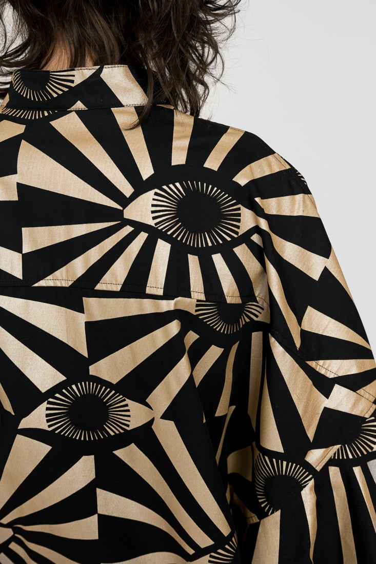 Tämä mekko on valmistettu ryhdikkäästä puuvillatwill -kankaasta. Kangasta koristaa Suomessa painettu kultainen Äidin valvova silmä -kuvio, jonka on suunnitellut Maija Louekari.