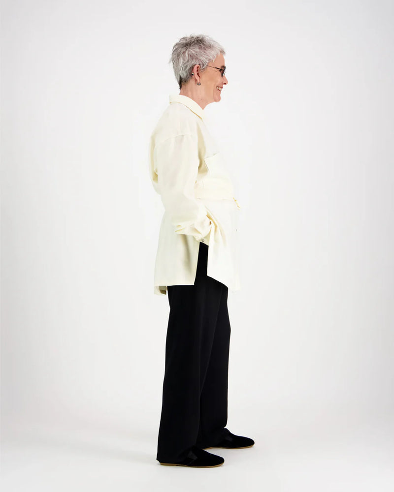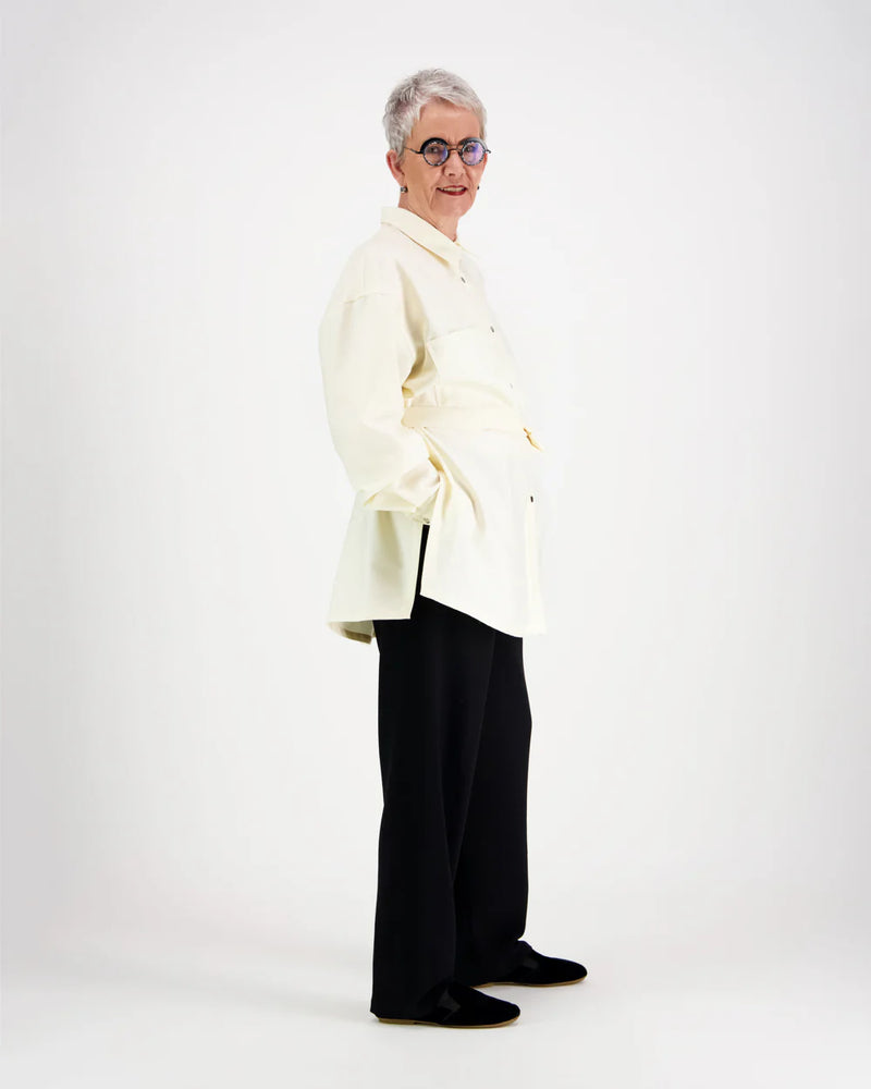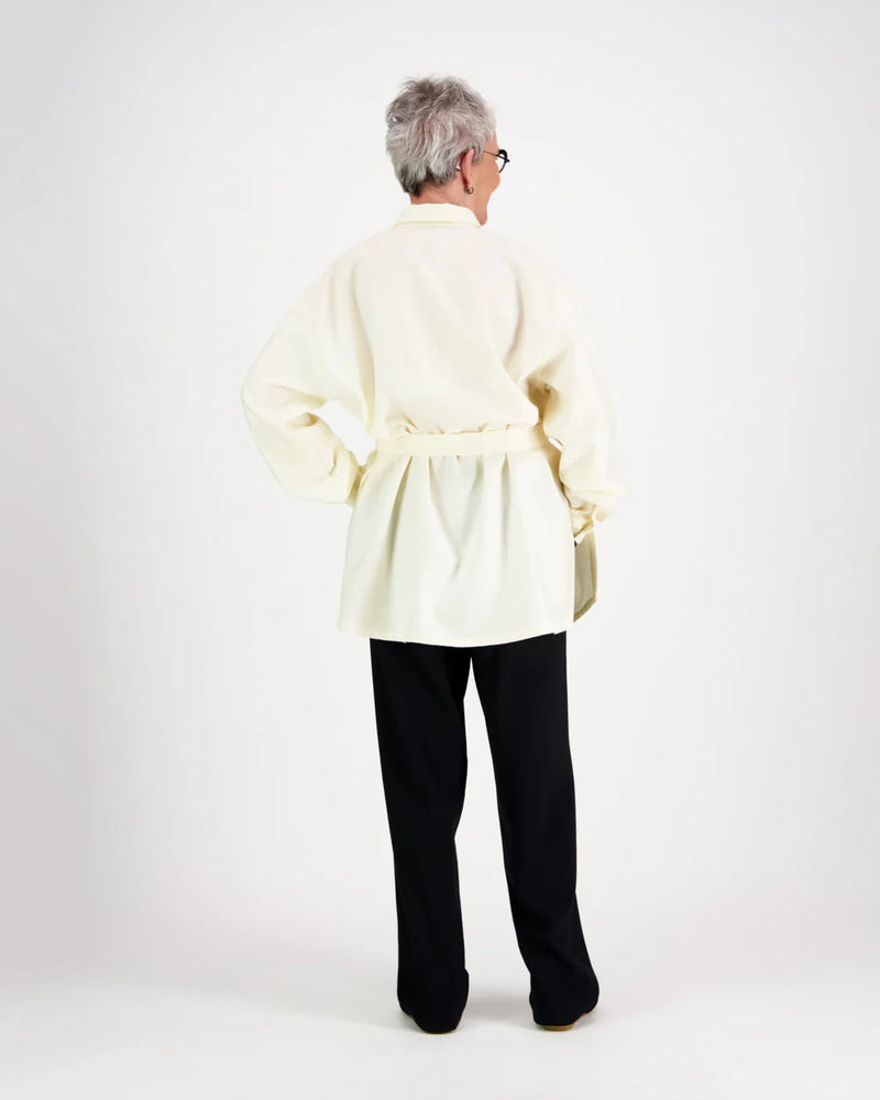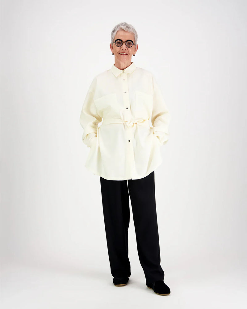 Rento yhden koon kauluspaita. Oversize- paidassa on kaksi rintataskua, nepparit edessä ja hihansuissa, halkiot sivussa. Mukana myös vyö samasta kuosista.