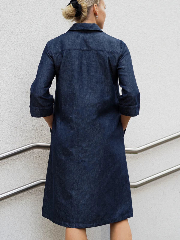 Janina-denimmekossa on kaikki ainekset arjen luottovaatteeksi, sillä se tuntuu päällä mukavalta, näyttää ajattoman siistiltä ja sopii jokaiseen vuodenaikaan. Mekko on valmistettu laadukkaasta eurooppalaisesta pellava-puuvilladenimistä, joka on miellyttävän kevyttä ja notkeaa. Pellava antaa kankaalle sopivasti hengittävyyttä ja puuvilla napakkaa ryhdikkyyttä. Mekko on malliltaan väljän paitamainen ja loivasti helmaa kohti levenevä. Mekossa on paitakaulus ja edessä napituslista, joka päättyy vyötärön yläpuolelle. Hartiakaarroke ja väljyyslaskokset antavat mukavasti liikkumatilaa selkäpuolelle. Hihat ovat puolipitkät ja hihansuissa on leveät käänteet. Sivusaumoissa tietenkin taskut. Vaate on tuotepesty ja siten valmiiksi esikutistettu, joten se ei kutistu enää kotipesuissa. Kankaan väri tumma denimsininen ei myöskään haalistu pesuissa vaaleaksi. Janina-mekko on suunniteltu Suomessa ja ommeltu lähituotantona Virossa pienessä ompelimossa.