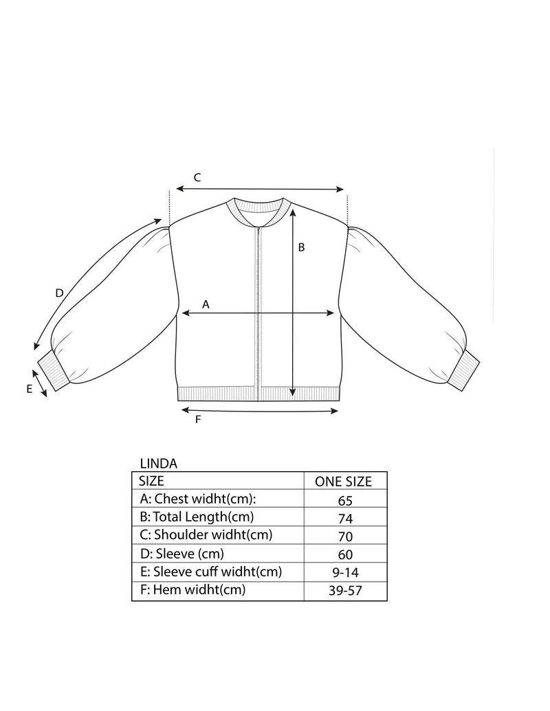 LINDA on ihana rento bomber-mallinen takki. Takki on mitoitukseltaan oversize, joten se sopii monenkokoiselle käyttäjälle. Takin hihoissa olkasaumassa on rypytys, joka luo klassiseen takkimalliin mielenkiintoa. Takissa edessä on vetoketju, sekä helmassa ja hihoissa joustavat resorit. Linda-bomber on täydellinen valinta viileiden säiden kaupunki-lookkeihin sekä rentoon oleskeluun.