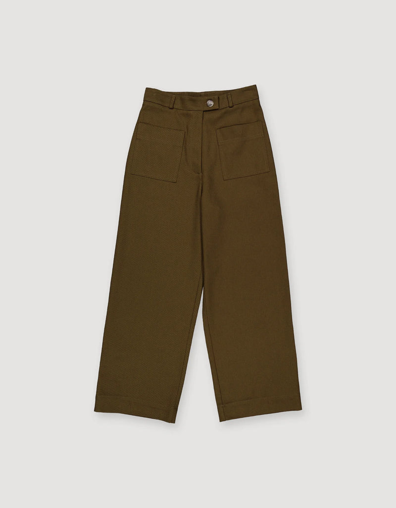 The twill trousers are crafted from khaki green heavy cotton. The trousers are fitted at the waist with otherwise relaxed straight silhouette and cropped length, belt hoops and patch pockets in front and back.
