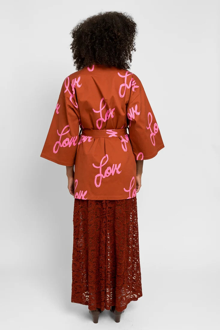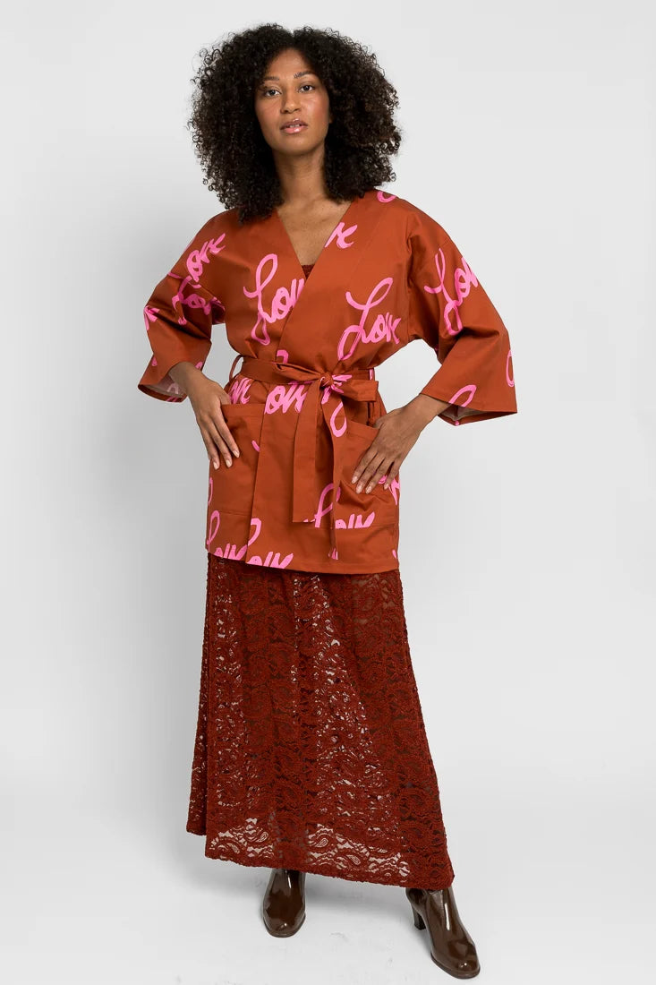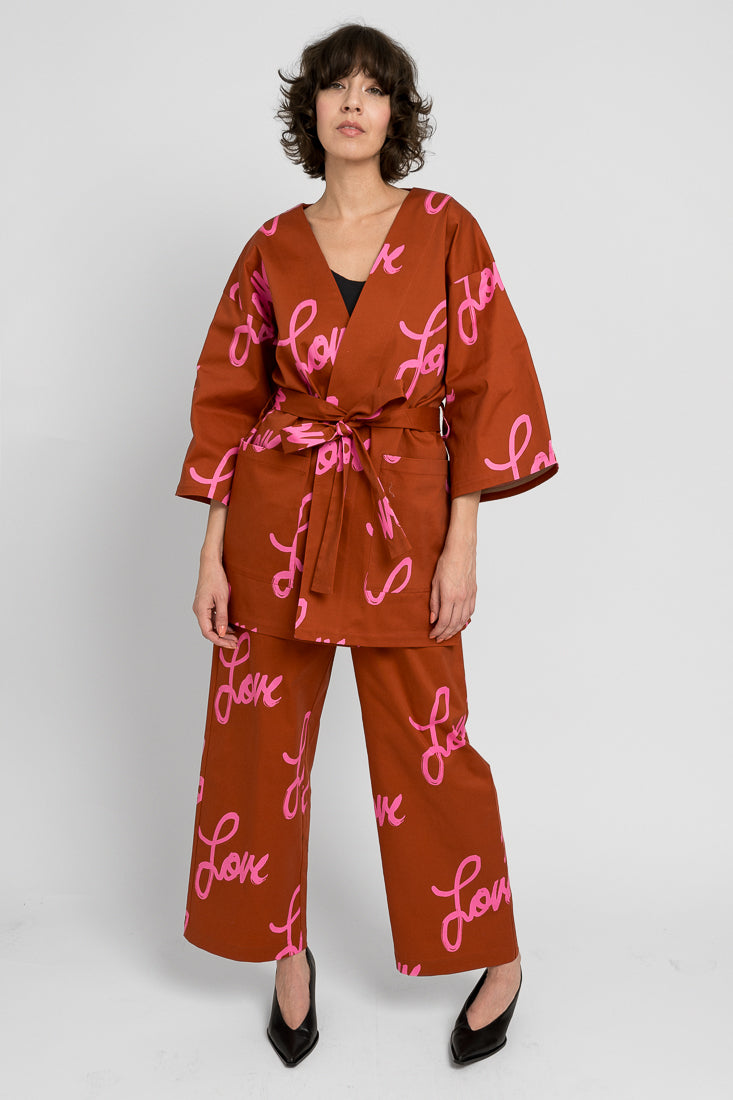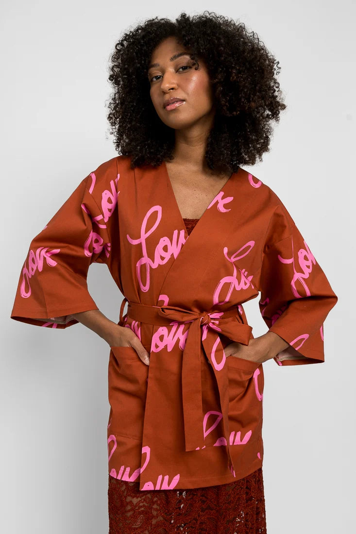 Materiaalina jämäkkä, mutta joustava puuvilla twill-kangas. Kangasta koristaa Maija Louekarin suunnittelema Love-kuosi uudessa ruosteen ja vaaleanpunaisen värityksessä.