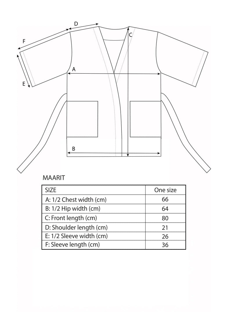 Maarit-kaftaanin istuvuutta voi säädellä vyötäröllä olevalla vyöllä. Kaftaanissa on väljät hihat ja malliltaan se on suora, helma ylettyy lantion ala puolelle. Malli sopii hyvin erilaisille vartalotyypeille ja onesize-koko on testattu toimivaksi S-L koon käyttäjillä.
