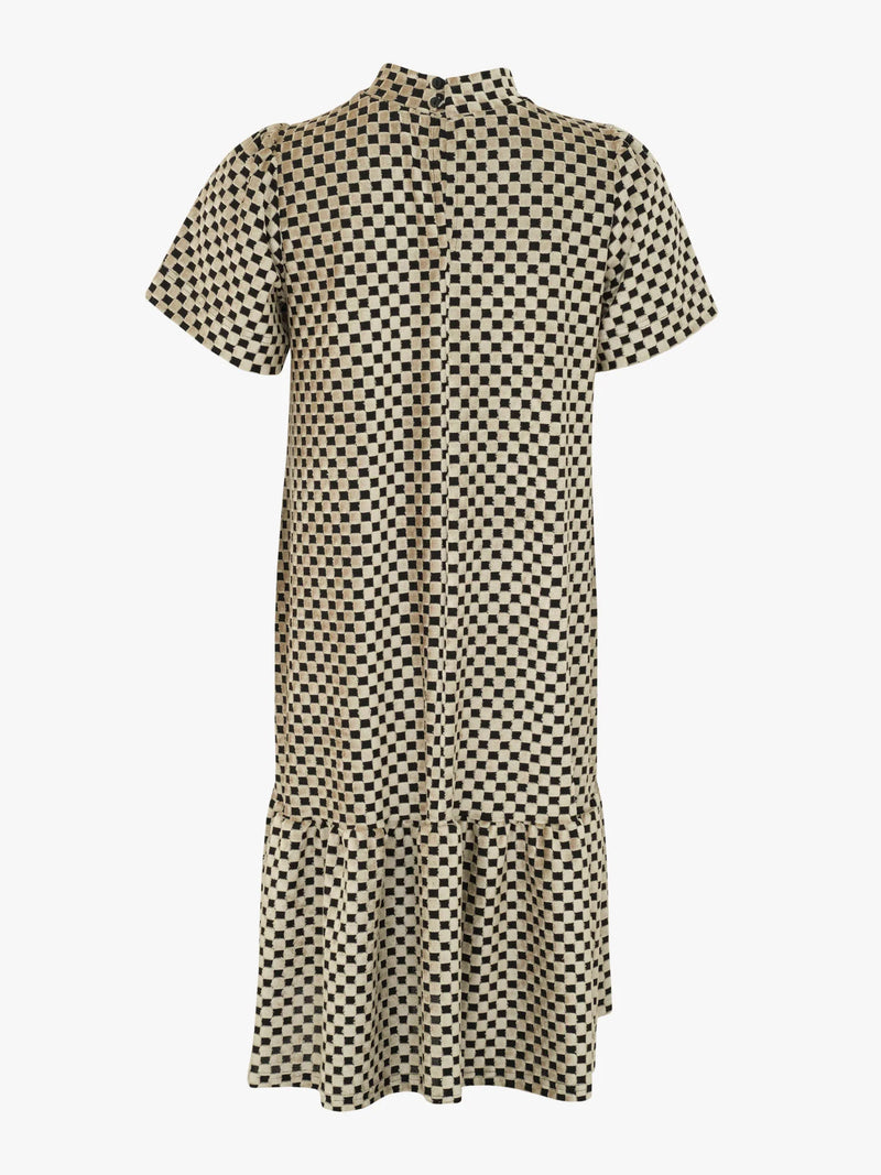 Hohtava, A-linjainen Montana mekko on tilaisuuksien valopilkku! Mekko on valmistettu juhlavasta Chess -jakardineuloksesta, joka laskeutuu kauniisti. Kankaassa on himmeästi hohtavia velour-ruutuja mustalla pohjalla. Montana-mekko on näyttävä ja samalla mukava valinta esimerkiksi illallistreffeille tai juhlaan, sekä aina kun kaipaat hieman lisähohdetta päivääsi! Mekossa on lyhyet hihat, matala poolokaulus ja runsas frillahelma. Niskassa nappikiinnitys kahdella mustalla muovinapilla.