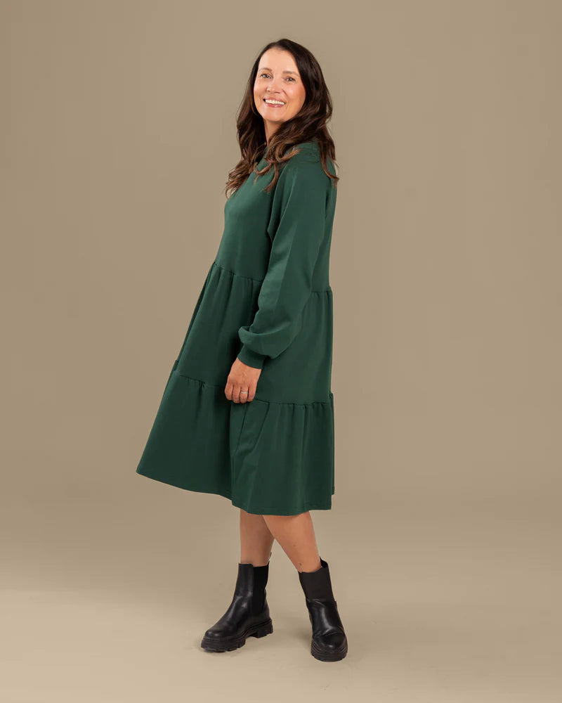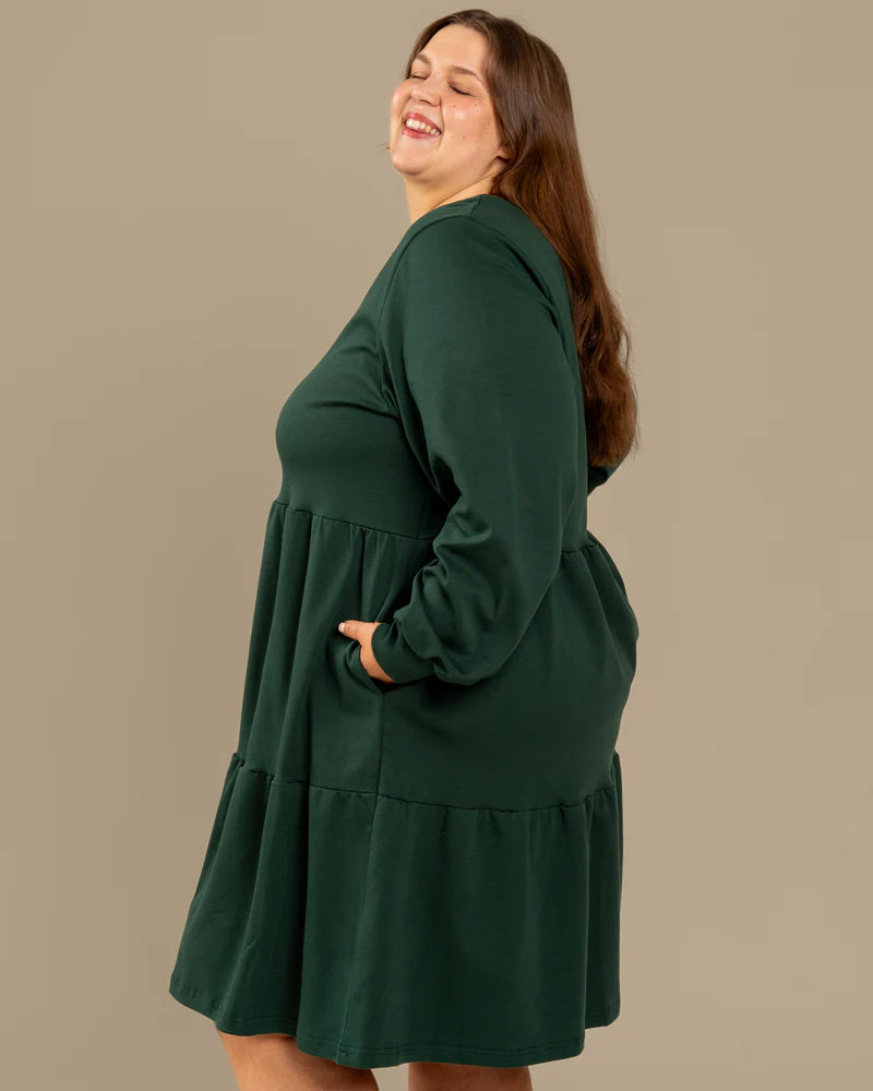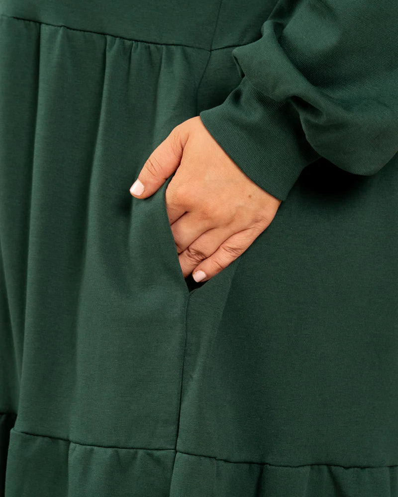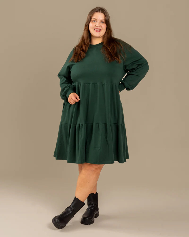 Pitkähihainen tummanvihreä mekko, jossa on pyöreä pääntie ja toivotut taskut. Materiaalina ihanan mukava ja laadukas interlock-neulos.