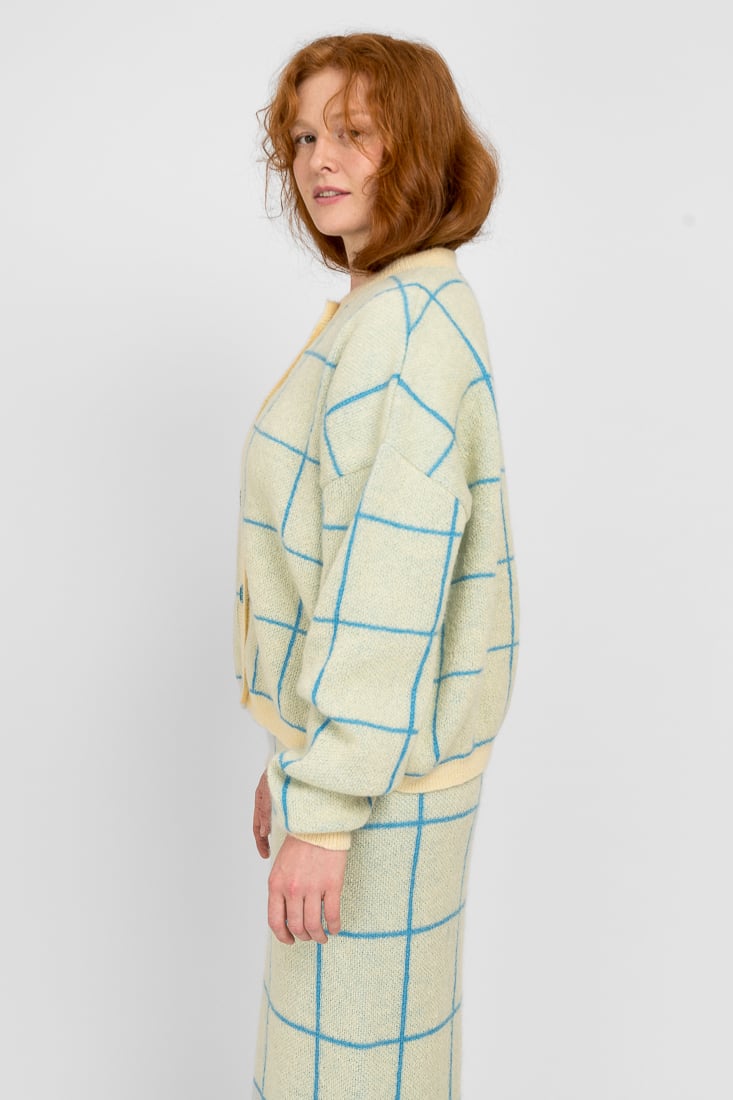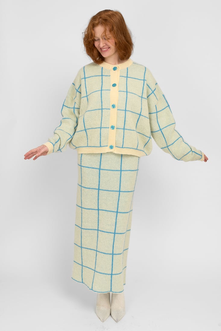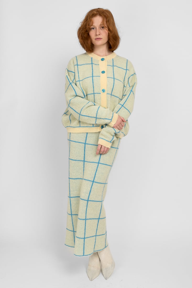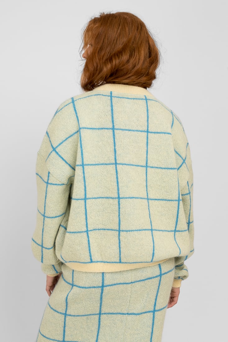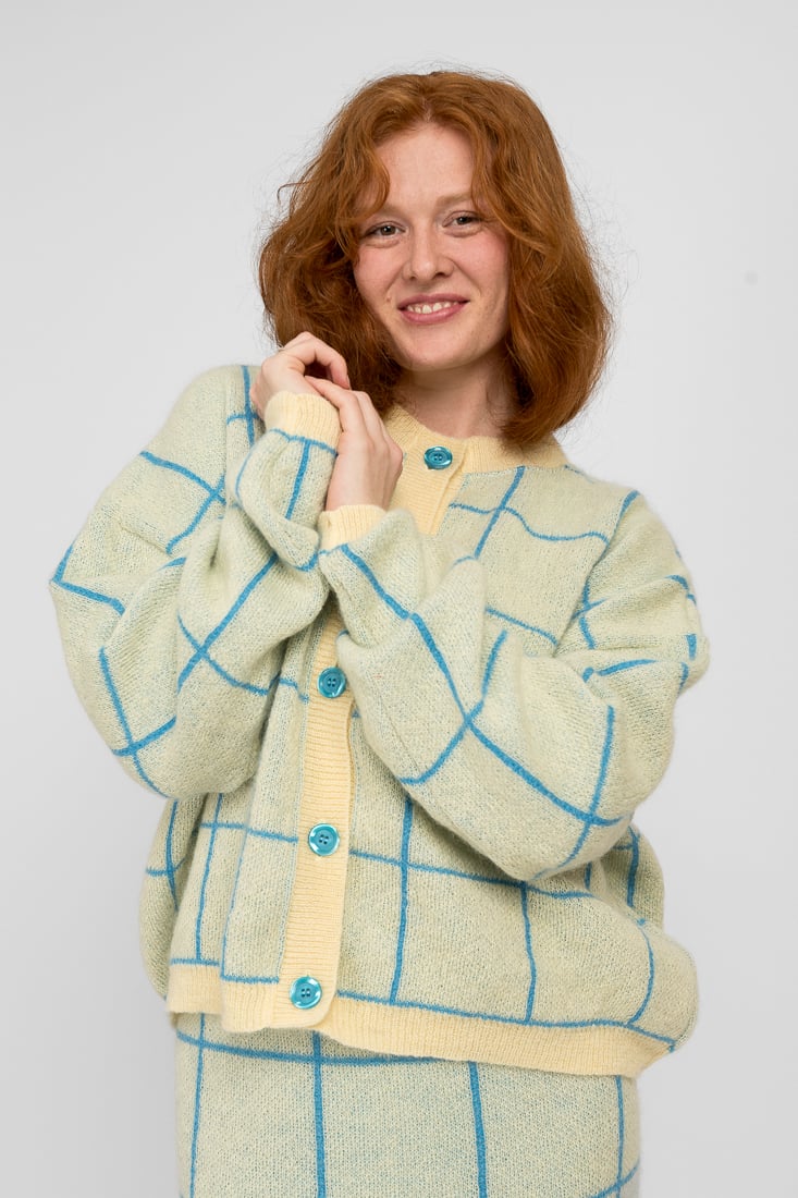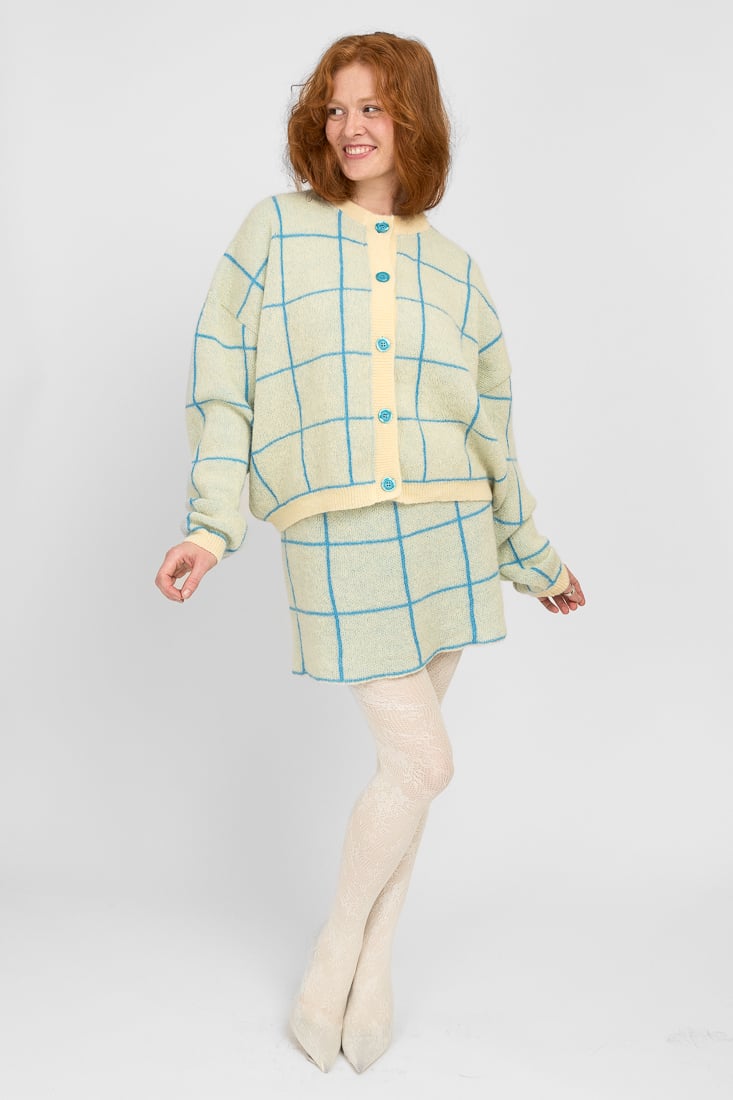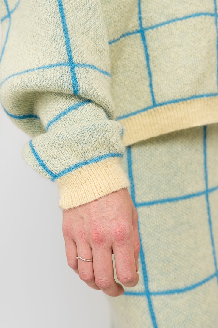 Tämä mohairsekoiteneule on suunniteltu ja valmistettu rakkaudella Suomessa. Mallimme on 174cm pitkä.