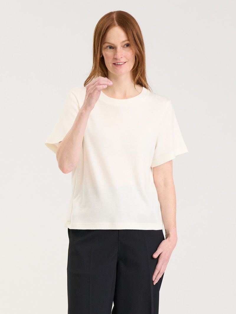 Merinovillasta valmistettu rento T-paita. Pehmeä ja lämmin merinoneulos.