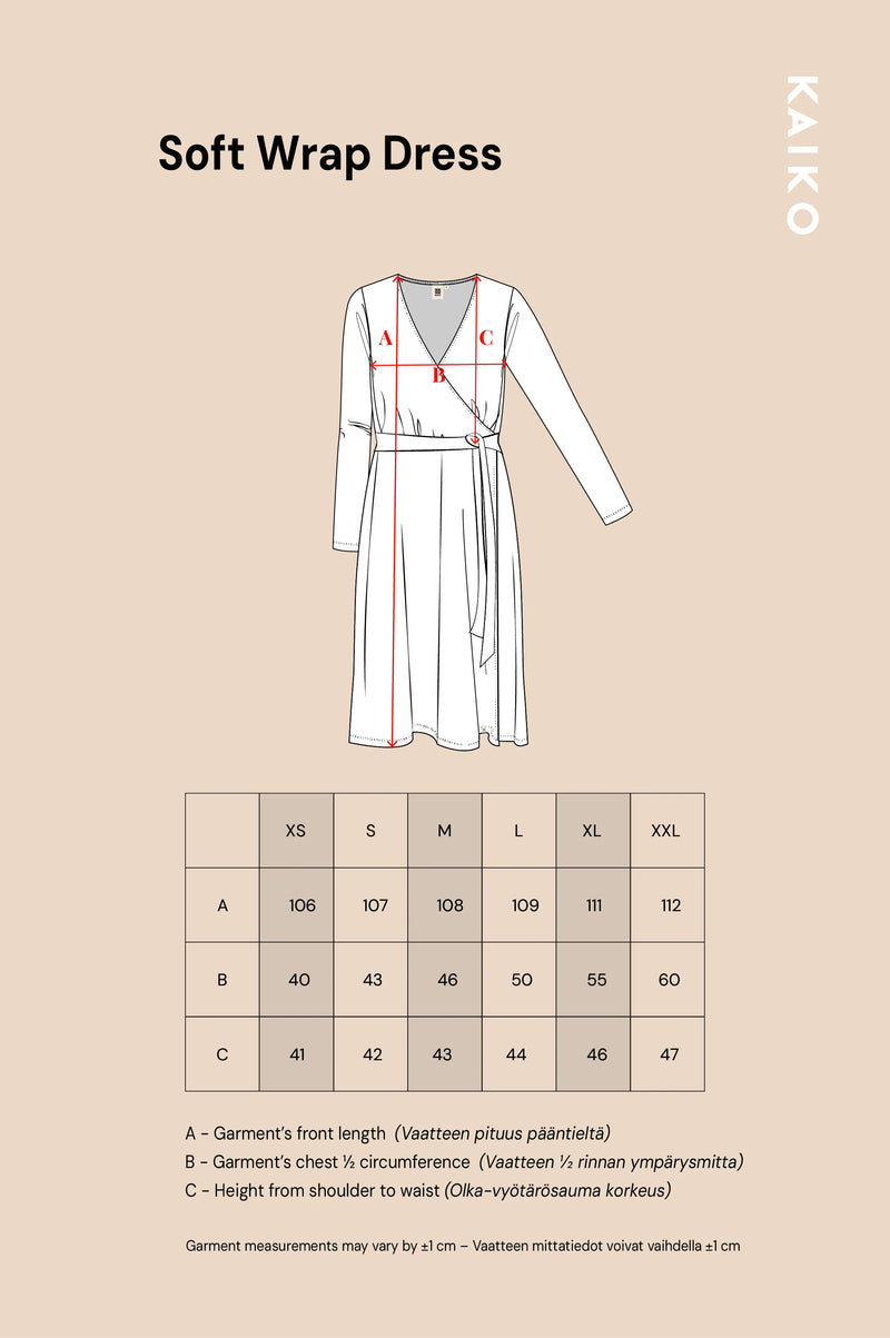 Soft Wrap Dress vastaa hyvin kokoaan. Käytä koon valinnan apuna vartalonmittataulukkoa ja vaatteen mittoja (viimeinen kuva). Malli on 169cm pitkä ja käyttää kokoa XS.