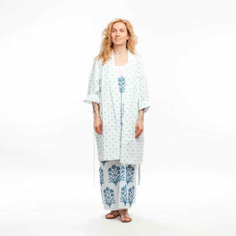 Made from soft, absorbent cotton, this loose-fitting kimono-style robe is ideal for lounging at home, post-sauna, or stepping out of the pool. The fabric is hand block-printed using traditional techniques — where wooden blocks dipped in dye are stamped with steady hands and practiced rhythm.