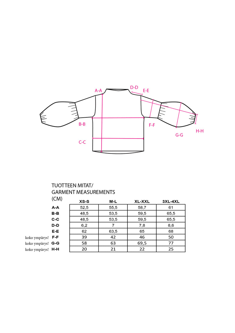Materiaali: 100% merinovilla. Neulos on neulottu Suomessa, Orivedellä. Villa on mulesing-vapaata ja peräisin Argentiinasta ja Uruguyasta. Lanka on kehrätty Euroopassa.