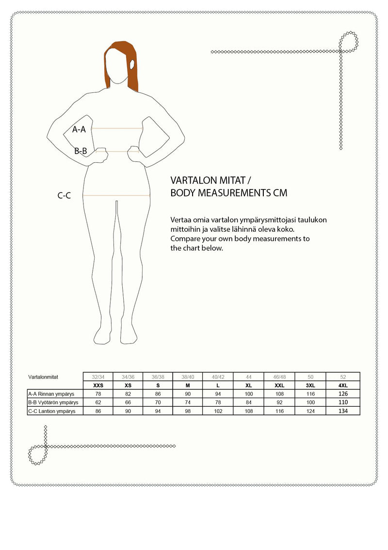 Väljä mitoitus: jos olet mitoiltasi kahden koon väliltä, suosittelemme valitsemaan pienemmän. Jos haluat rennomman istuvuuden, valitse koko mitoitusohjeemme mukaan.
