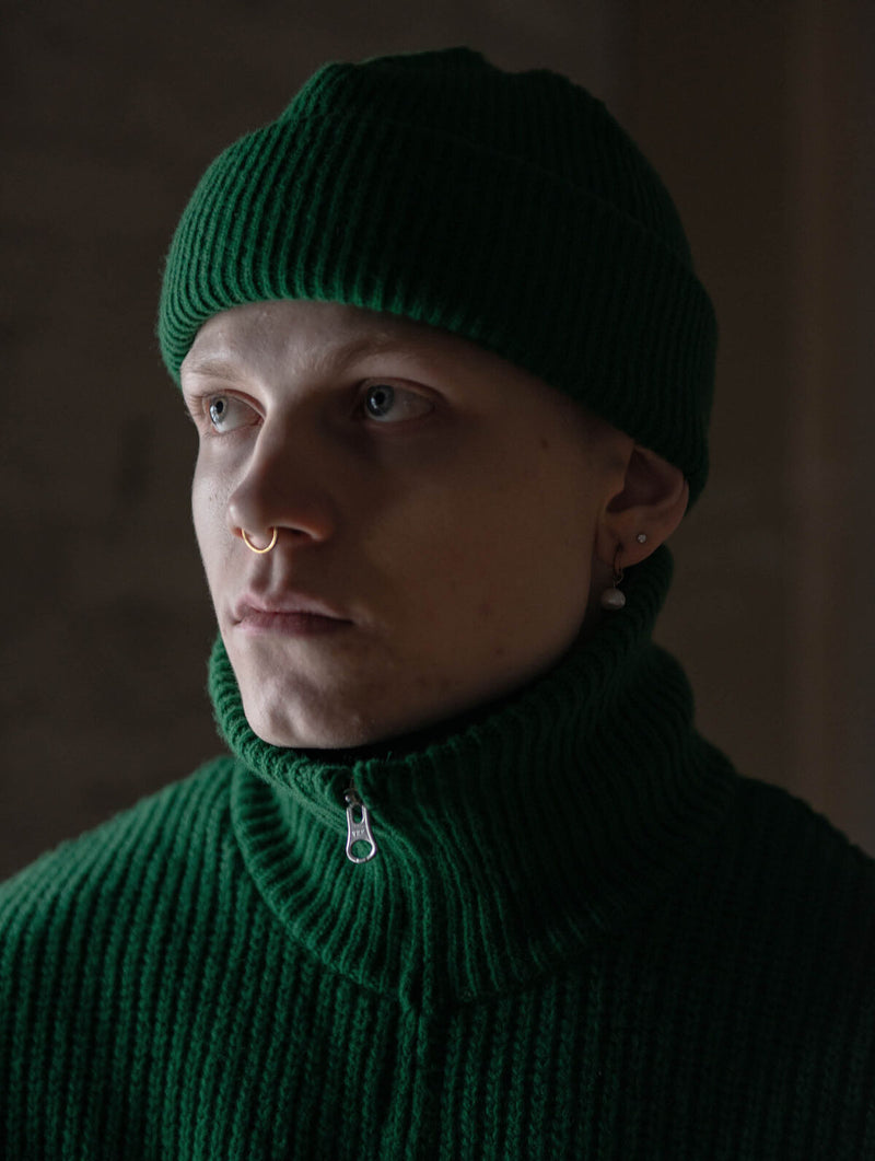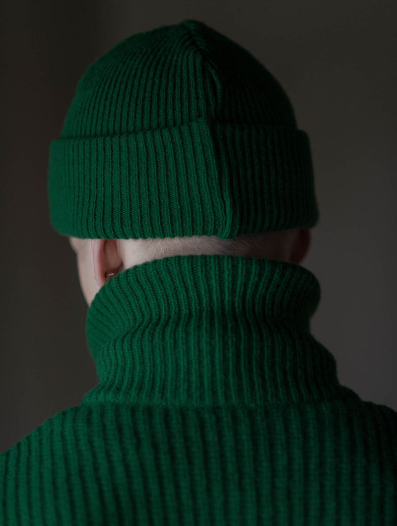 Paksusta villasekoitelangasta valmistettu ribbipipo. Taitettava reunus.