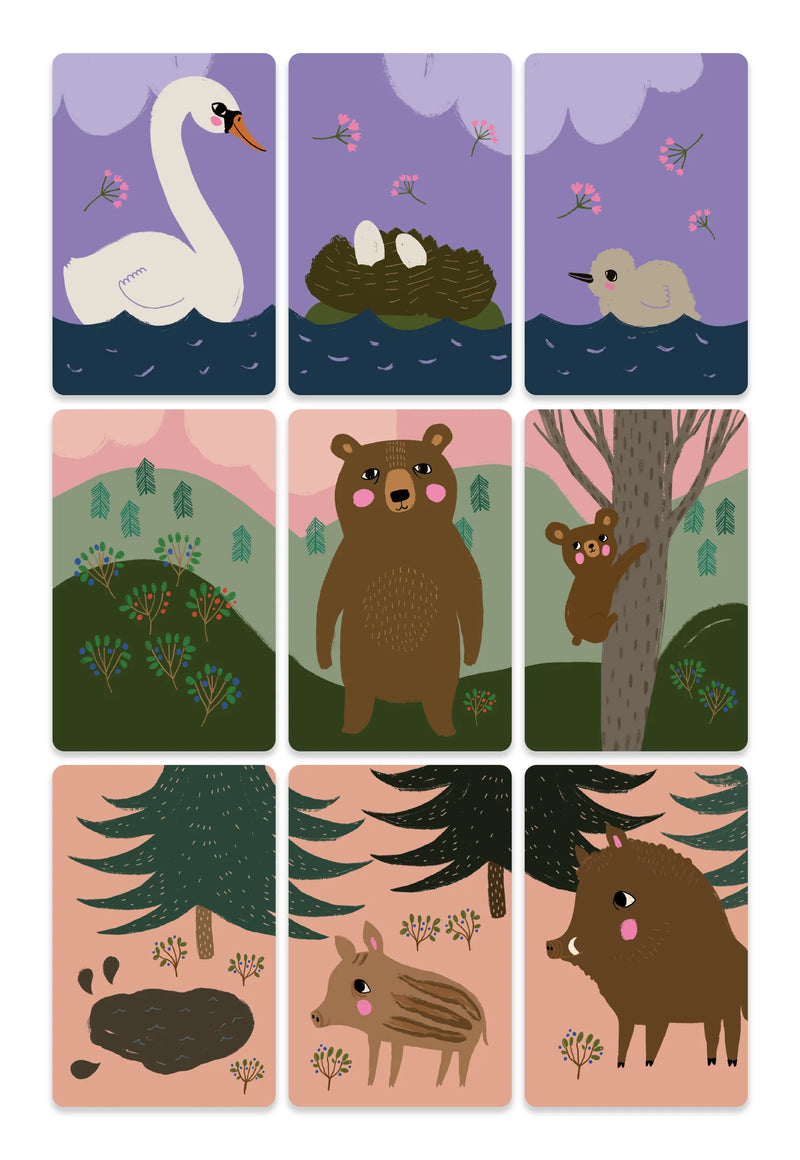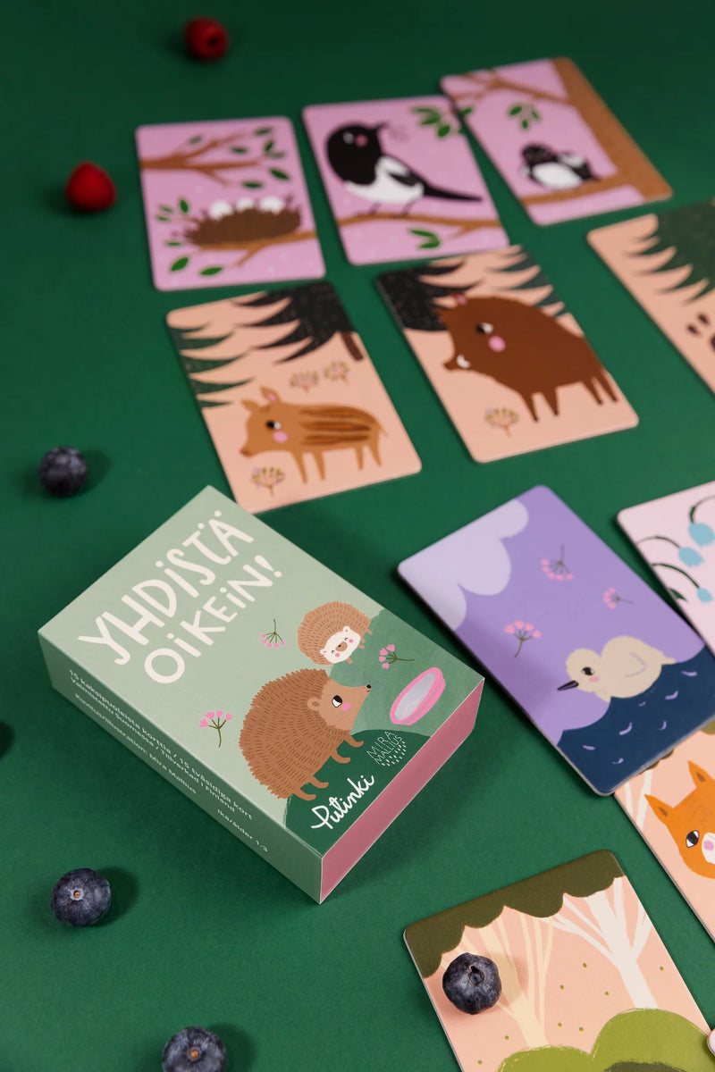 Yhdistä oikein -lasten peli. Yhdistä kolmesta kortista kokonainen kuva. 15 korttia, 10 valmista kuvakokonaisuutta. Korteissa molemminpuolinen kuvitus.