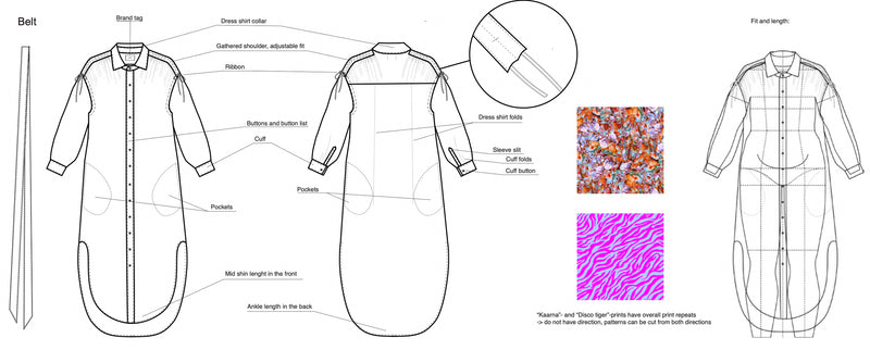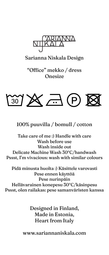 Office-mekko on todellinen klassikko! Töihin tai juhlaan soveltuva muunneltava design on varustettu funktionaalisilla yksityiskohdilla ja valmistettu digipainetusta puuvillapopliinista. Puseromekossa on taskut, säädettävä istuvuus olkapäillä ja puseron kaulus ja hihansuut viimeistelevät skarpin, mutta rennon ilmeen. Office-mekko kuuluu Sarianna Niskala plus size -mallistoon ja onesize-mallia on testattu eri vartalotyypeillä, -kokoisilla ja -käyttäjillä. Tähän mennessä kaikki keskikokoisista plus-koon käyttäjiin (koot 36-56) ovat näyttäneet upeilta tässä ainutlaatuisessa mekossa, joka voidaan säätää kokosi mukaan - vaikka kokosi muuttuisi! Mukana tulevalla vyöllä voit säätää mekon tyyliä ja istuvuutta. Mekossa on taskut!