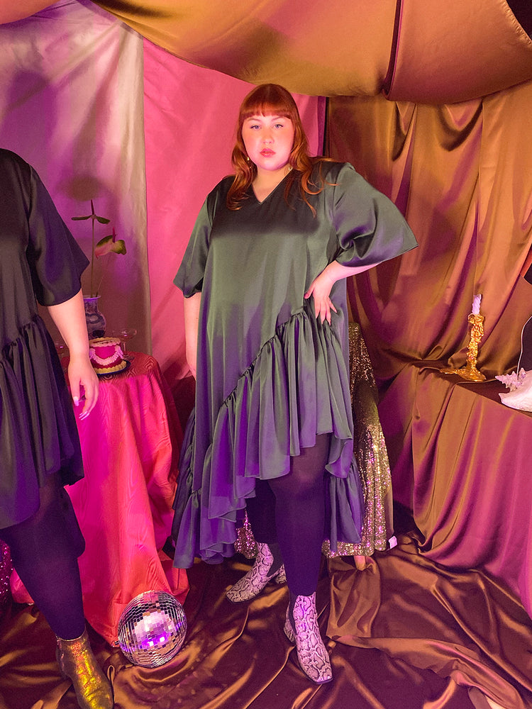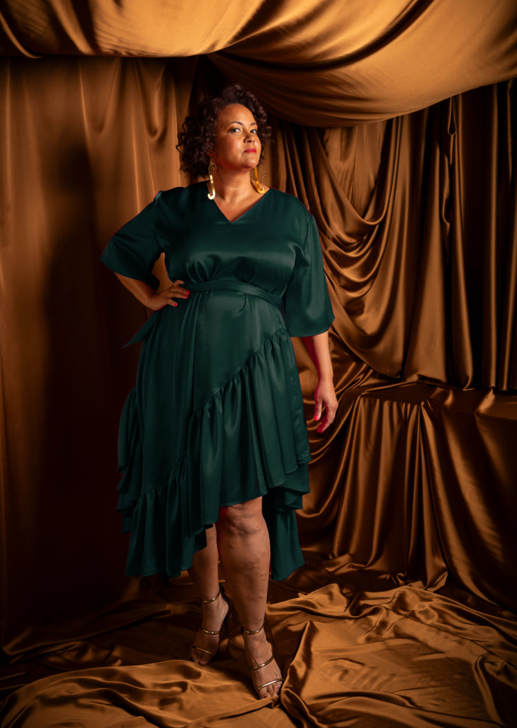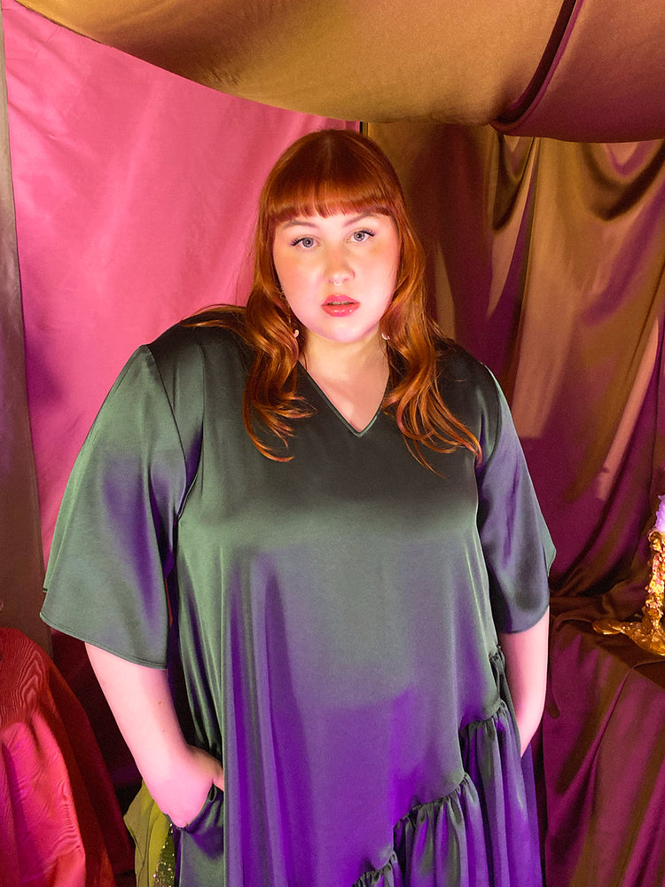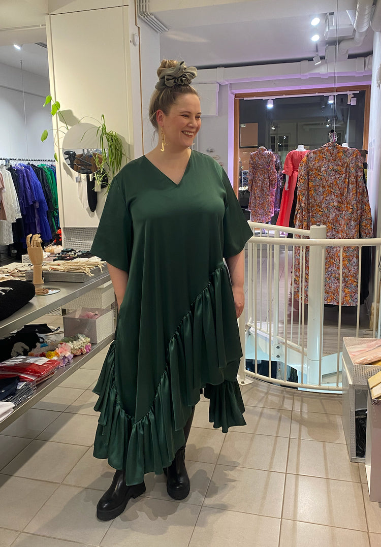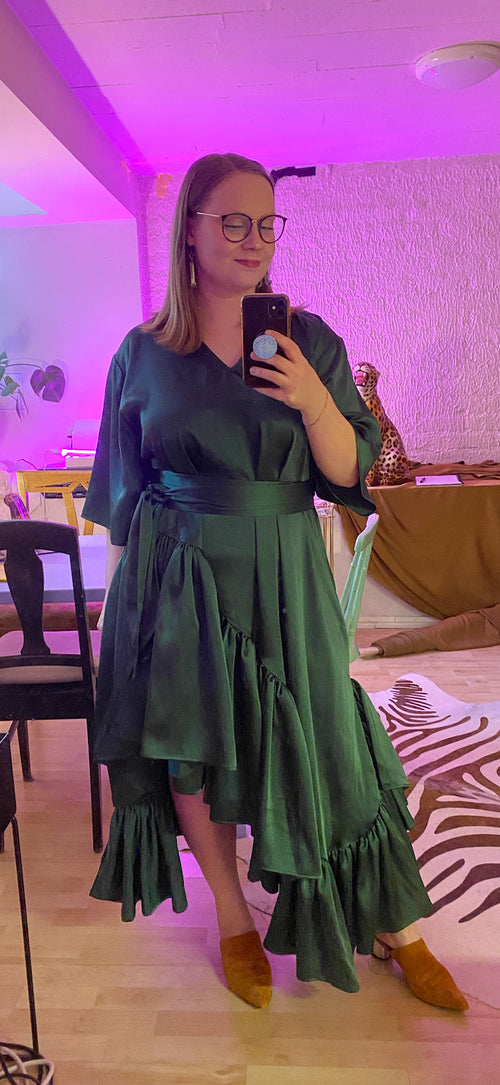 Dramaattinen, lumoava design älykkäillä yksityiskohdilla (mekossa on piilo-TASKU!). Valmistettu polyesterisatiinista, mekossa on V-pääntie. S-helma mekko kuuluu Sarianna Niskala plus kokoiseen vaatemallistoon ja yhden koon mallia on testattu eri kokojen ja pukeutumistyylien kuluttajilla sekä monilla vartalotyypeillä. Sopii koolle 36-54. Tähän mennessä kaikki keskikokoisista pluskokoisiin käyttäjiin ovat näyttäneet upeilta tässä mekkomallissa.