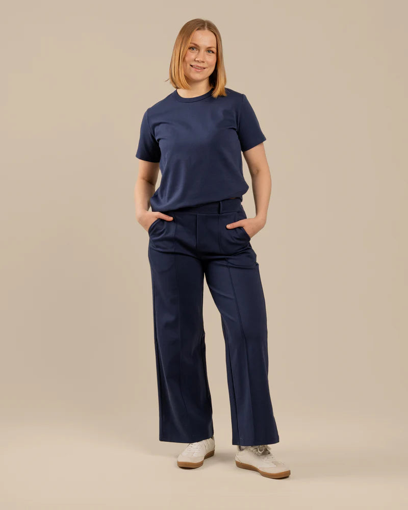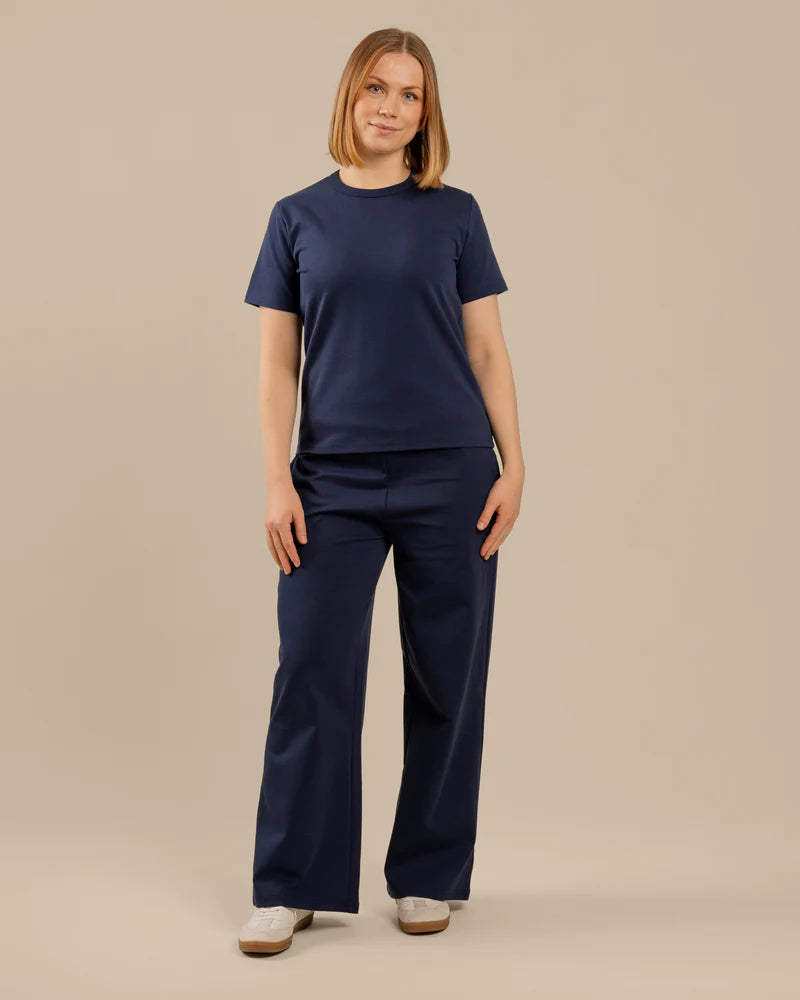 Arki t-paita on rento t-paita, joka on suunniteltu naisten vartalonmittataulukon avulla. T-paita on paksua, laadukasta neulosta joka on päällä ihanan tuntuinen. Paidassa on hieman normaalia leveämpi pääntien resori, joka antaa paidalle viimeistellyn ilmeen. Sävynä tyylikäs tummansininen.
