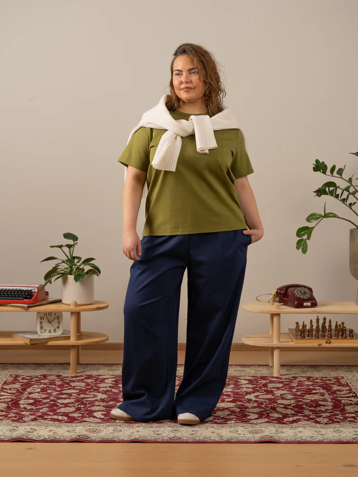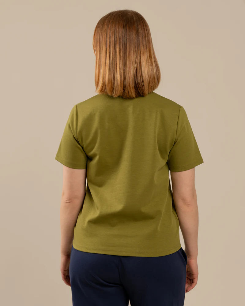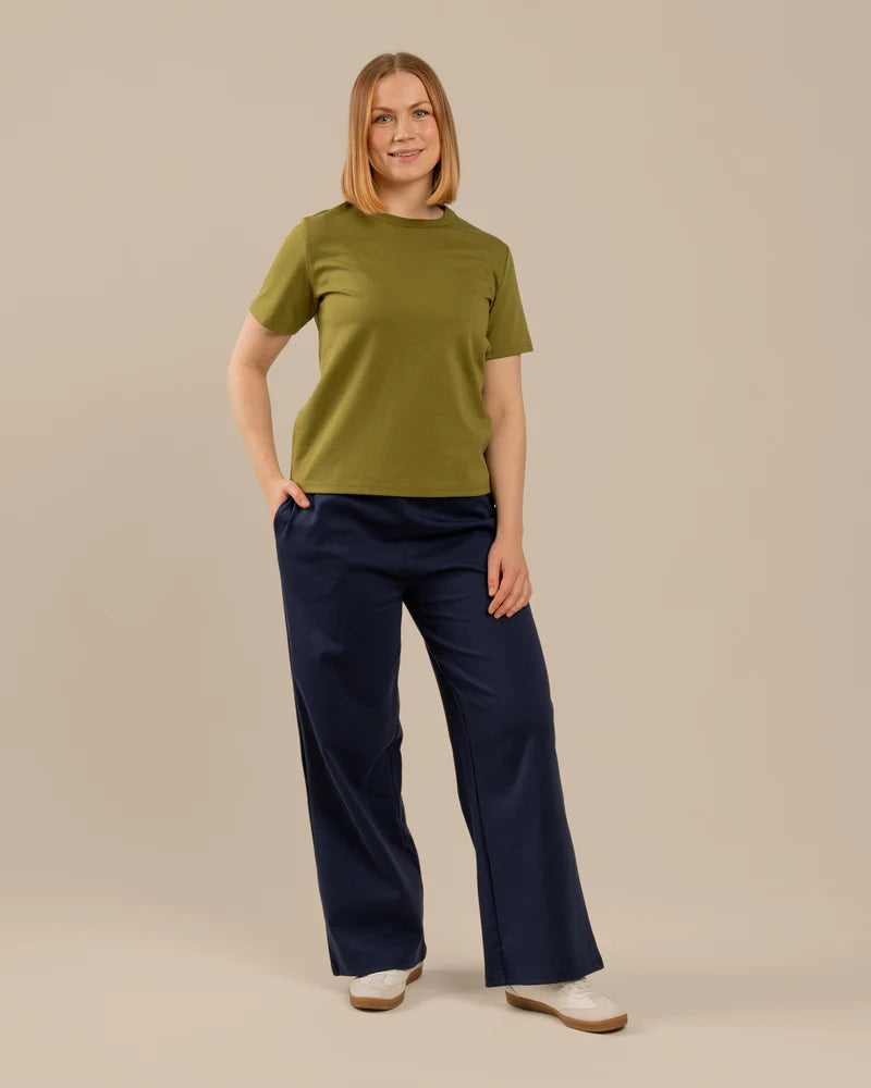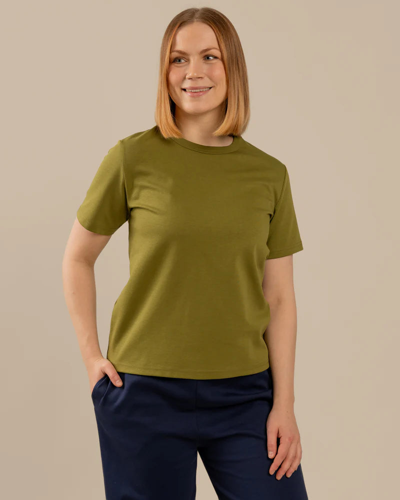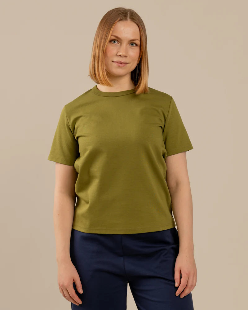Sammaleenvihreä Arki t-paita on rento t-paita, joka on suunniteltu naisten vartalonmittataulukon avulla. T-paita on paksua, laadukasta neulosta joka on päällä ihanan tuntuinen. Paidassa on hieman normaalia leveämpi pääntien resori, joka antaa paidalle viimeistellyn ilmeen. Sävynä upea sammal.