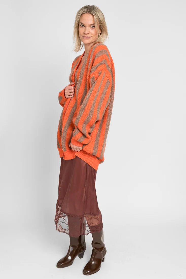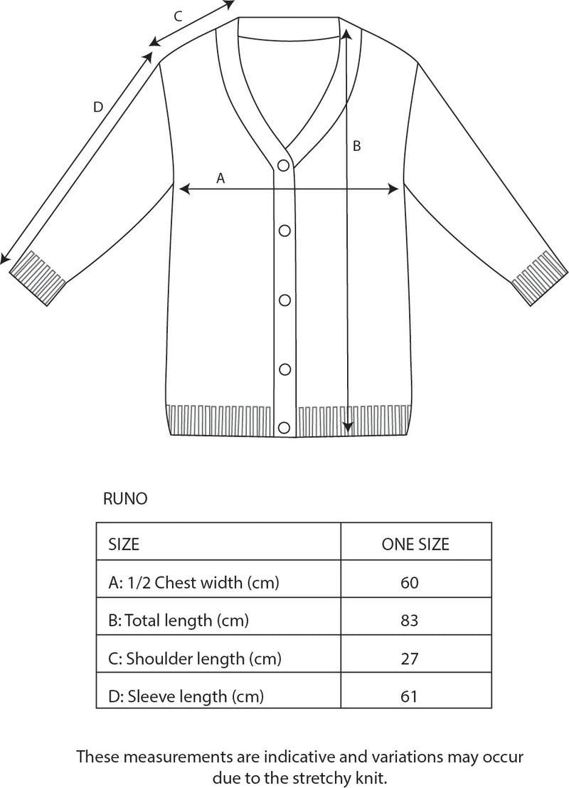 Runo-neuletakki on pehmeän pörröinen ja se sopii käyttöön vuoden ajasta riippumatta. Mohairneule toimii monilla ikään ja sukupuoleen katsomatta. Neuleeseen on hyvä ja turvallista pukeutua, se on kaunis, pehmeä ja puhutteleva. Neuletakki on malliltaan hieman pidempi, hihoissa ja helmassa on ribbineulosresorit. Edessä on nappikiinnitys.