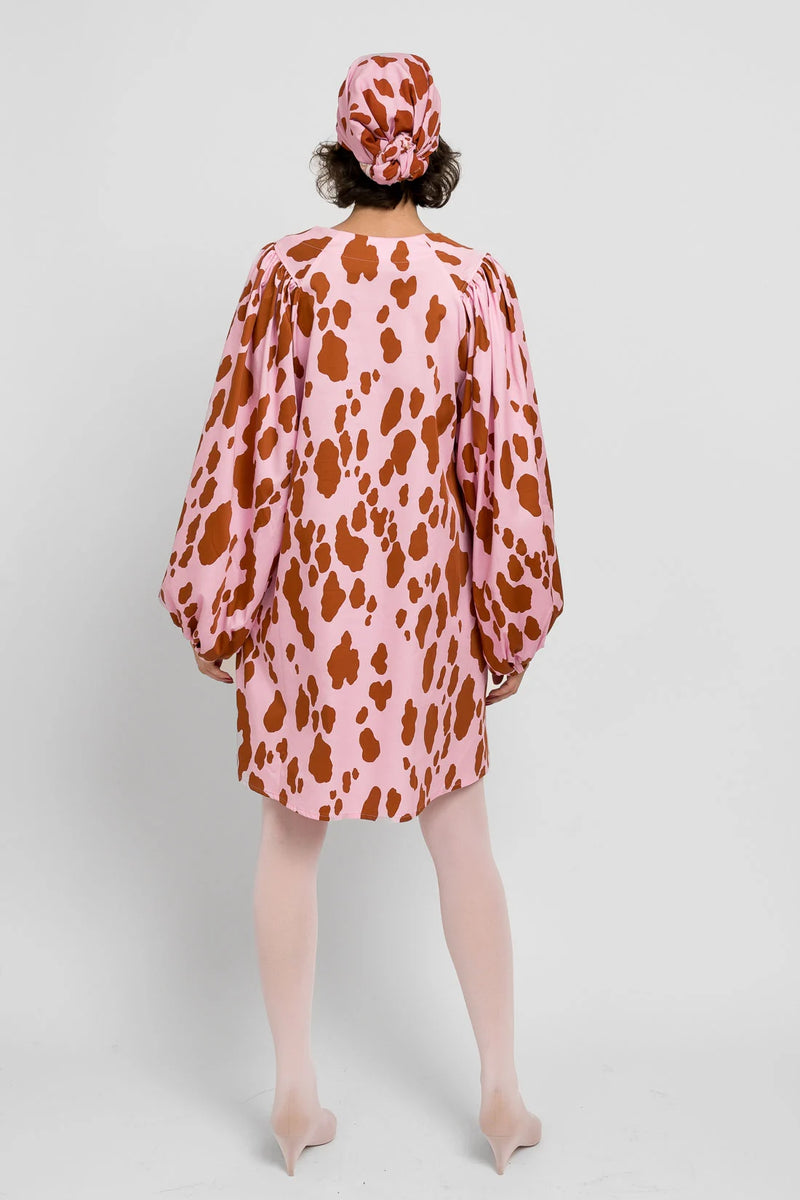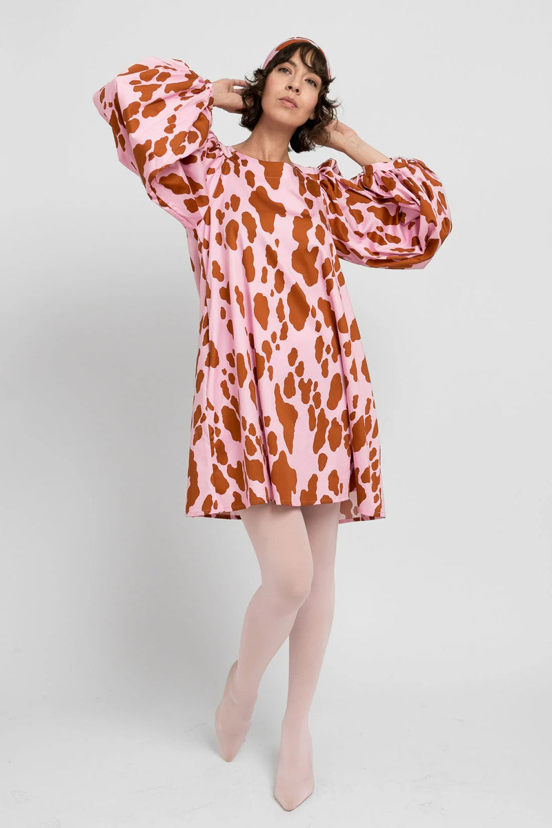 Tässä mekossa on materiaalina kauniisti laskeutuva puuvillasatiinikangas, jossa hieman elastaania tuomassa joustoa ja mukavuutta. Kangasta koristaa Maija Louekarin suunnittelema Mansikki-kuosi suloisessa vaaleanpunaisessa värityksessä.