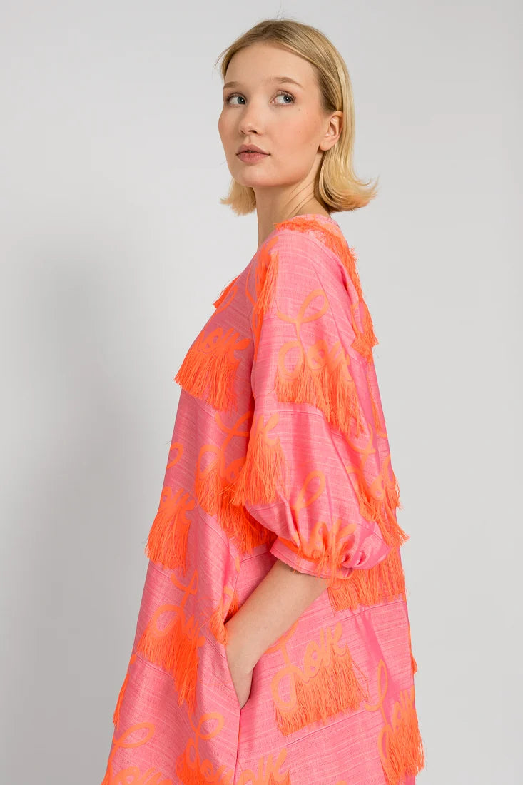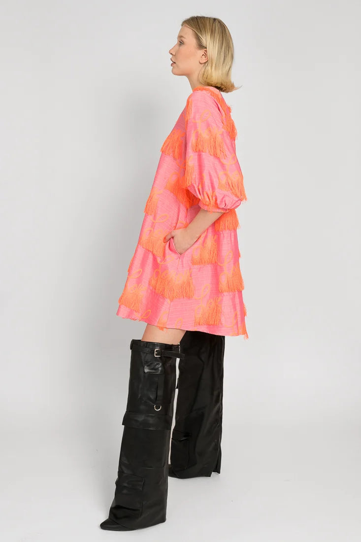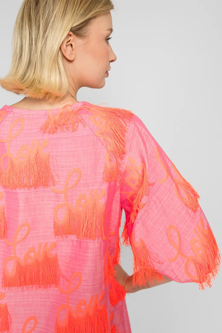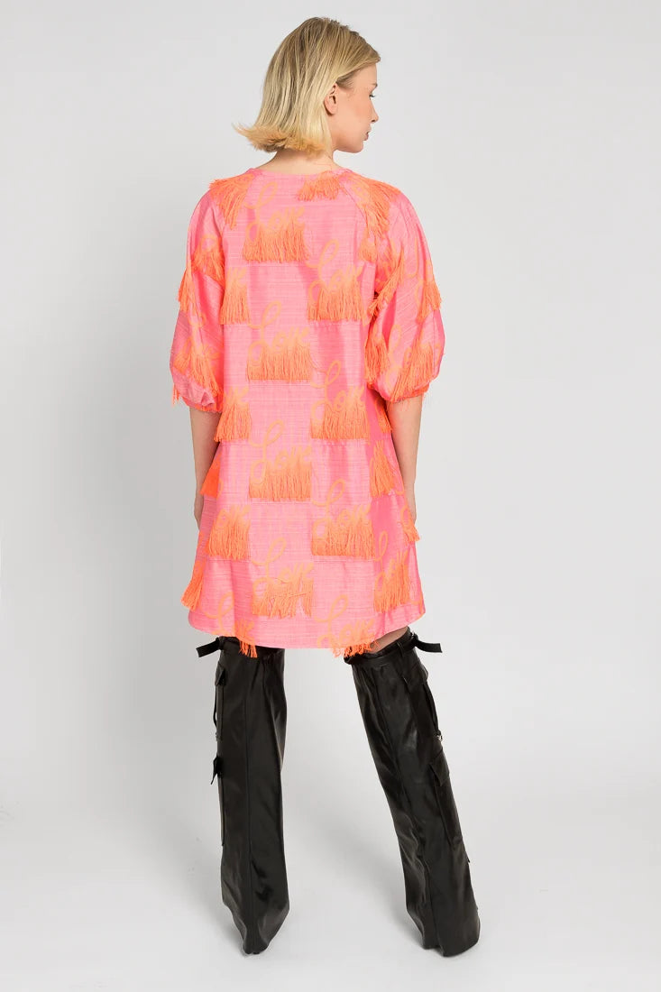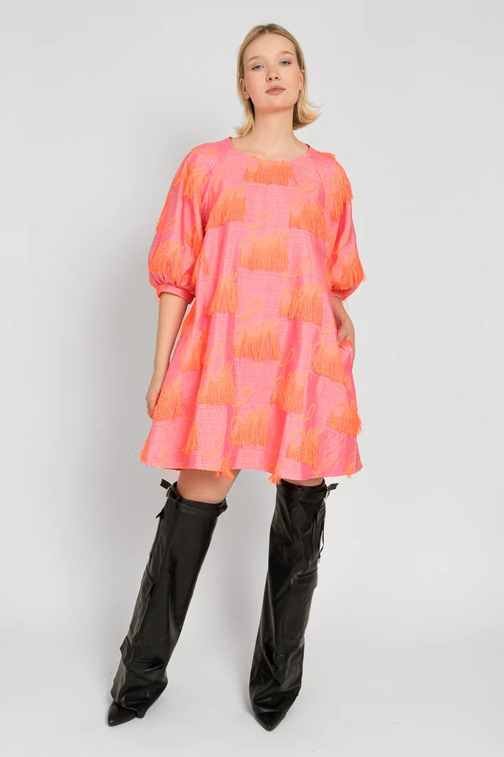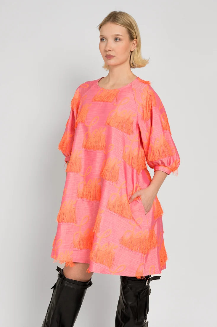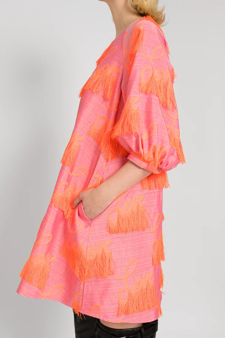 Tämä Senni-mekko on valmistettu laadukkaasta ranskalaisesta jacquardkankaasta, jossa on leikkisät hapsut yhdistettynä Maija Louekarin suunnittelemaan Love-printti.