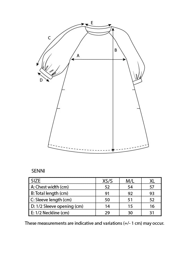 SENNI on kepeä mekko, jossa on puolipitkät puhvihihat ja sivuilla taskut. Pääntie on pyöreä ja mekko levenee helmaa kohti A-linjaisesti. Senni toimii mekkona ympäri vuoden – kesällä se kaipaa kaverikseen vain sandaalit tai tennarit, syksyllä ja talvella sukkikset ja maiharit.
