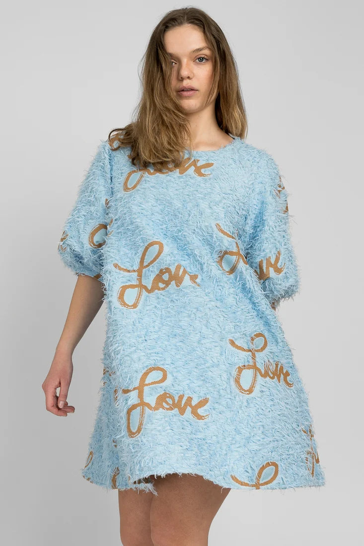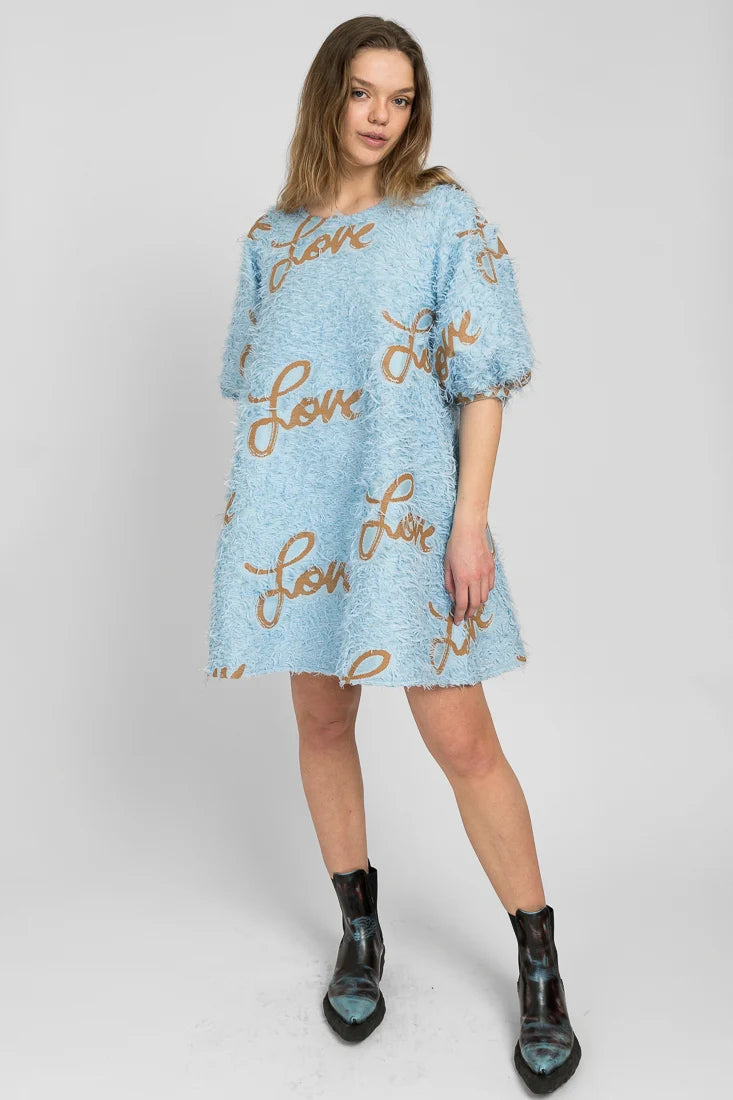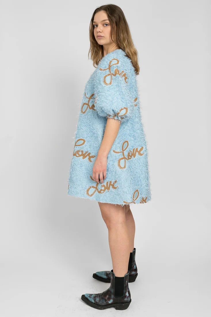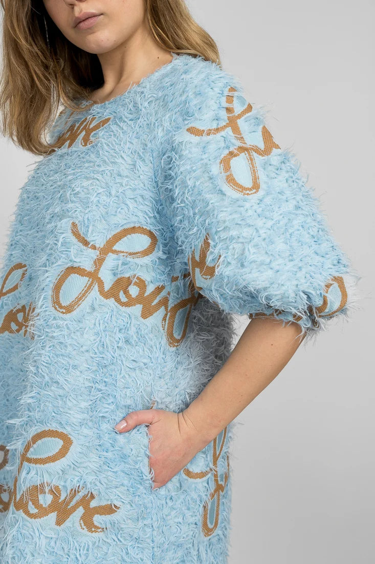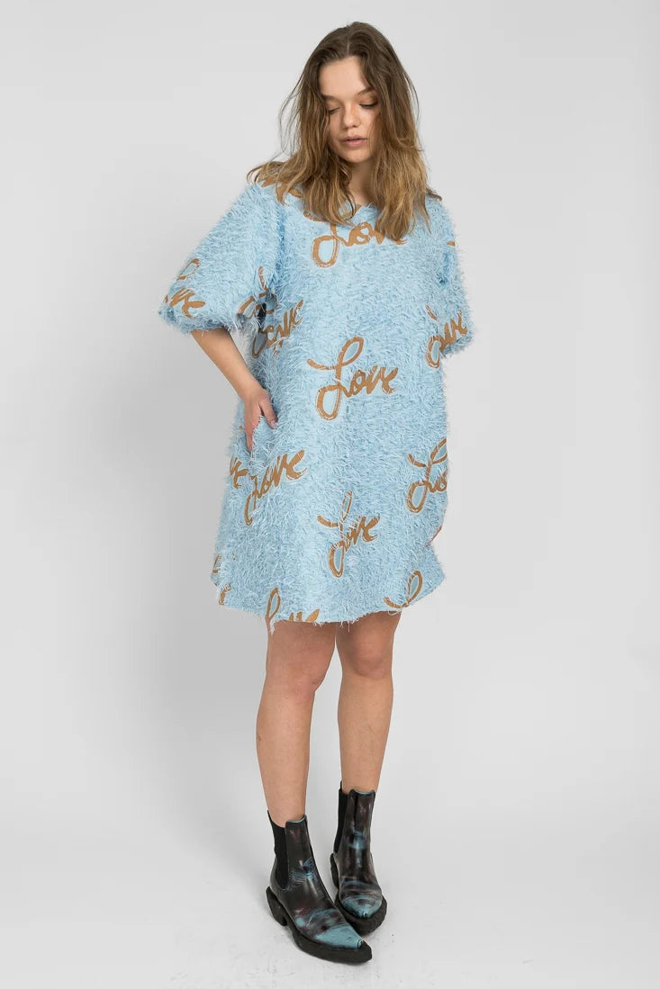 Senni-mekko on valmistettu laadukkaasta ranskalaisesta jacquardkankaasta, jossa on leikkisät hapsut yhdistettynä Maija Louekarin suunnittelemaan Love-printtiin.
