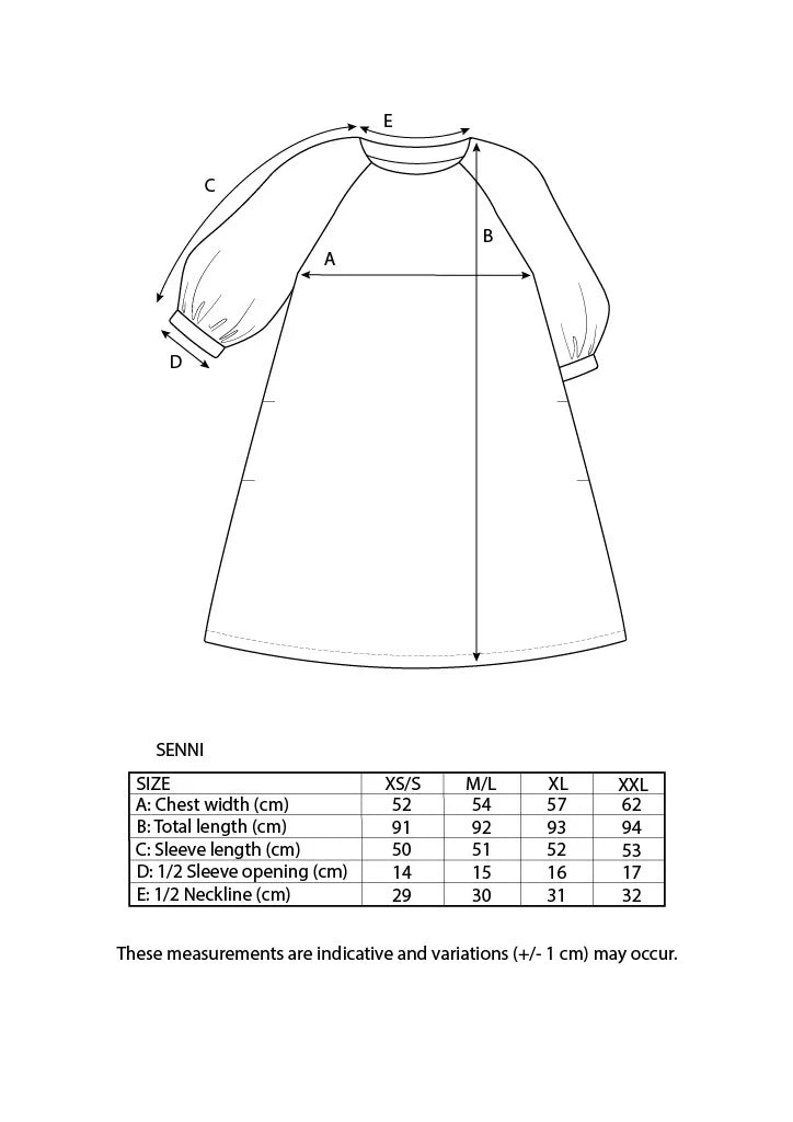 SENNI on kepeä mekko, jossa on puolipitkät puhvihihat ja sivuilla taskut. Pääntie on pyöreä ja mekko levenee helmaa kohti A-linjaisesti. Senni toimii mekkona ympäri vuoden – kesällä se kaipaa kaverikseen vain sandaalit tai tennarit, syksyllä ja talvella sukkikset ja maiharit.