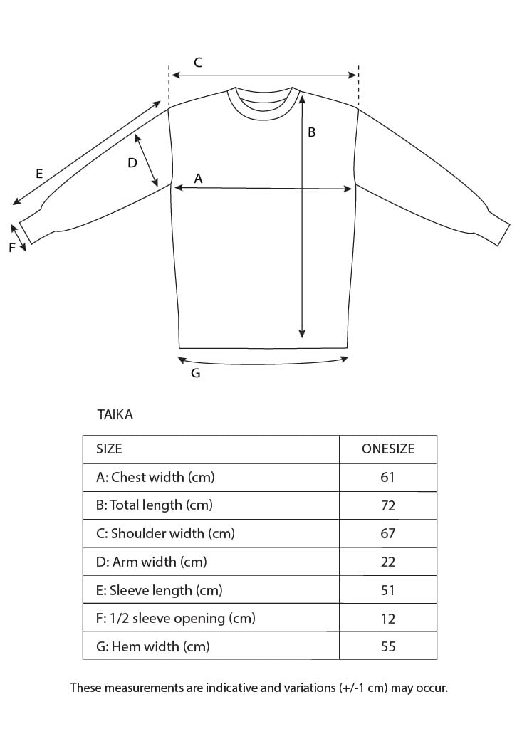 Taika-neule on yhden koon unisex-malli. Neuleessa on laskettu olkalinja ja hihoissa on reilusti pituutta. Istuvuudeltaan neule on oversize-tyylinen rento paita, jossa on mukavasti väljyyttä.