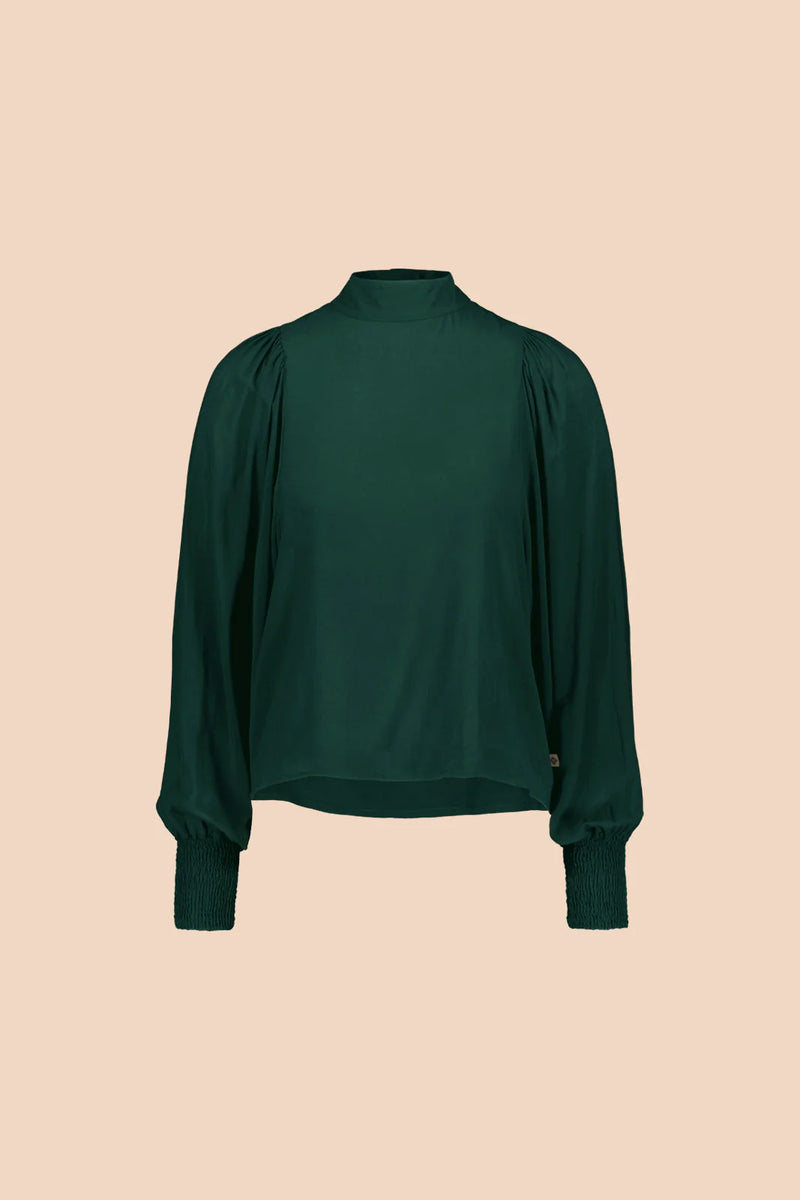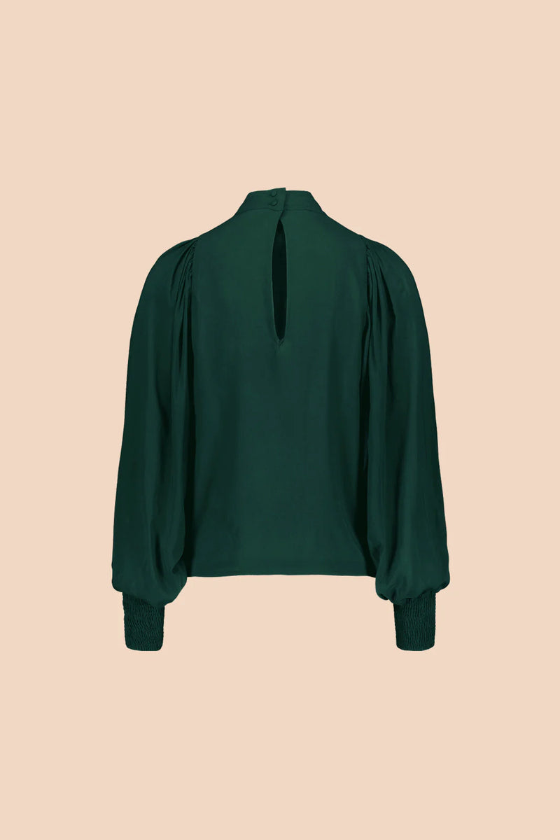 Klassiset design-elementit, kuten näyttävät volyymihihat ja elegantti smock-rypytys ranteissa, tekevät tästä pitkähihaisesta puserosta täydellisen valinnan sekä toimistopäiviin että juhlaan. Tyylikästä pystykaulusta koristavat selkäpuolella kauniit päällystetyt napit ja halkio. Paidan sävynä ajaton tummanvihreä.