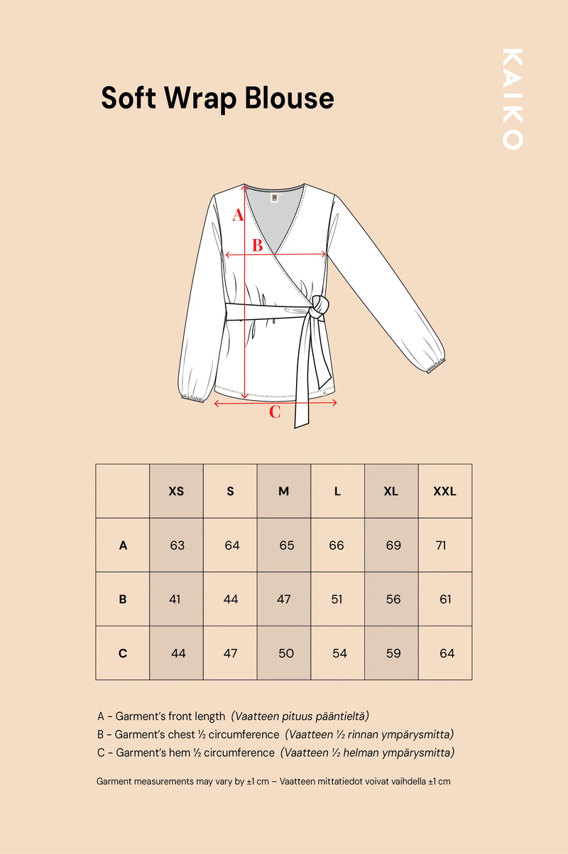 Soft Wrap Blouse vastaa hyvin kokoaan. Käytä koon valinnan apuna vartalonmittataulukkoa ja vaatteen mittoja (viimeinen kuva).