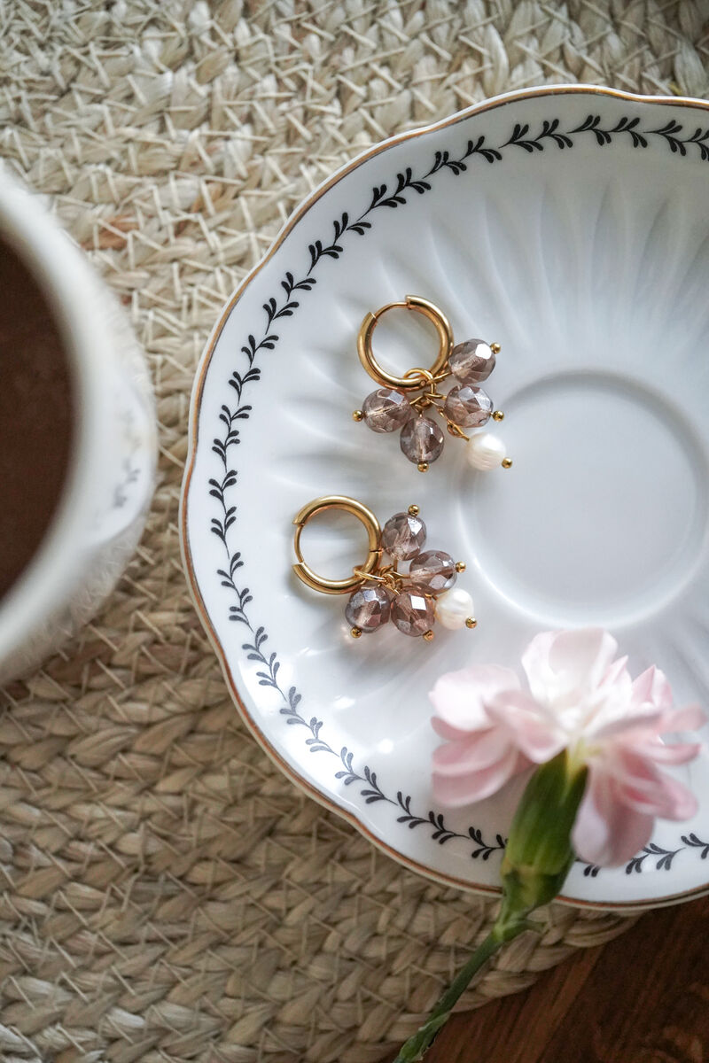 Makeanvedenhelmen ympärillä on pehmeän ruskean sävyisiä lasihelmiä, jotka muistuttavat meitä kehoa ja mieltä virkistävästä aamukahvista.