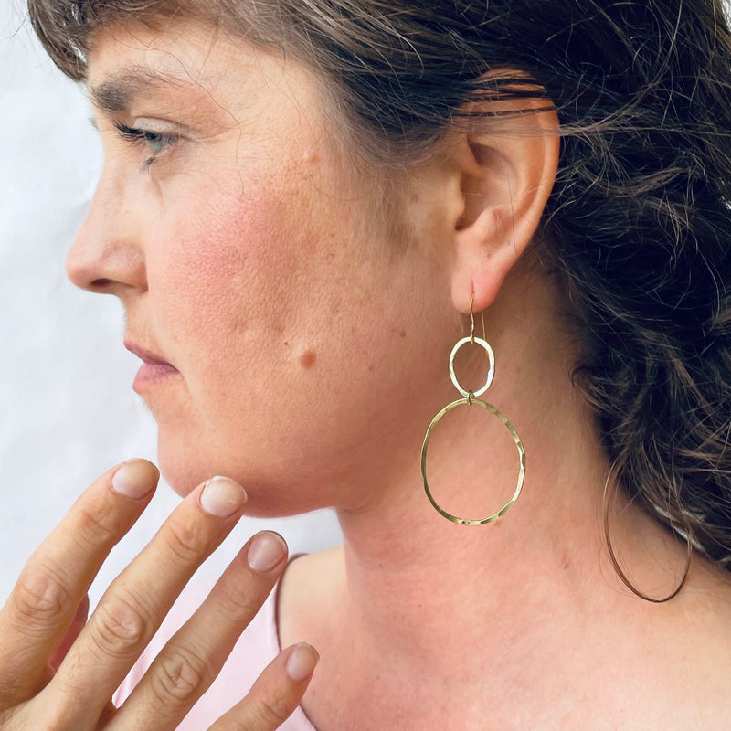 Korut koostuvat isommasta ja pienemmästä soikeahkon muotoisesta rinkulasta. Renkaat on muotoiltu viivoitinta käyttämättä, joten ilmoitettu koko vähän vaihtelee. Rinkuloiden pinta on taottu eläväisen näköiseksi. Korut on valmistettu Helsingin Kampissa pienessä käsityöläispajassa ja puodissa. Elli Hukan koruissa yhdistyy ajaton muotoilu skandinaavisten linjojen ja orgaanisen muotokielen kautta.